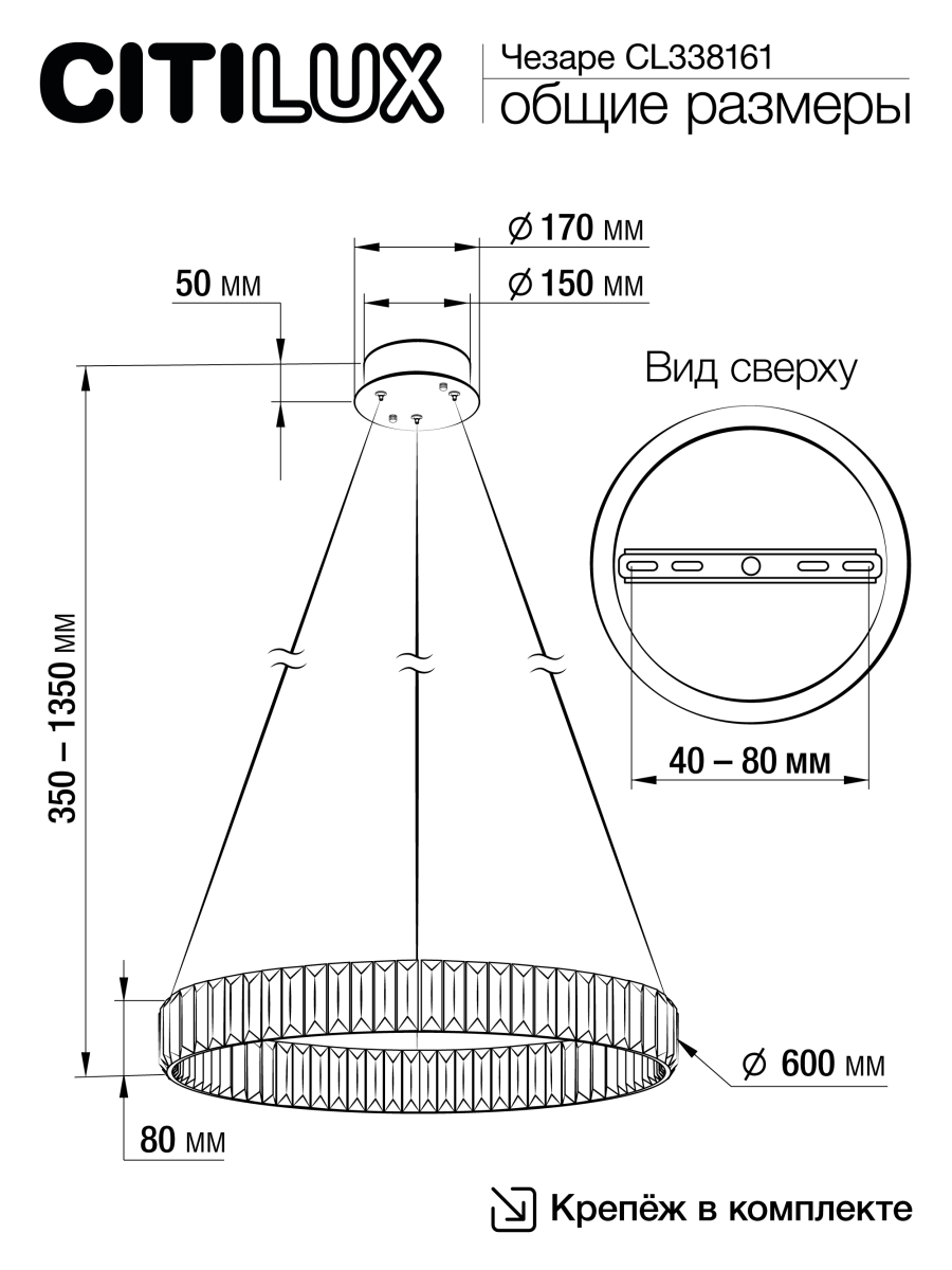 Высота подвесной модели легко регулируется в диапазоне от 35см до 1,35м, что делает ее идеальным решением для помещений с высокими, стандартными и низкими потолками. Диаметр кольца 600мм. Мощность изделия 50Вт, что позволяет ей осветить площадь до 18м², создавая при этом яркое и равномерное освещение.
