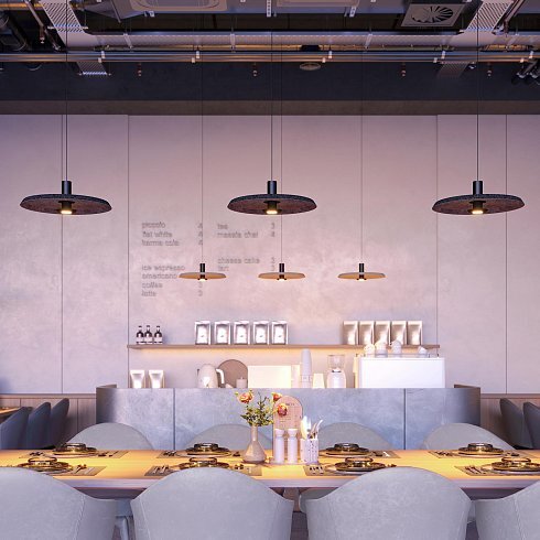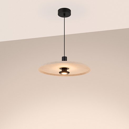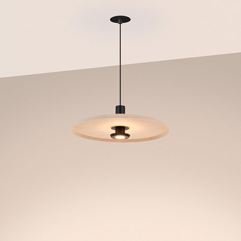 Подвесной светильник. Мощность 12 Вт, св. поток 648 лм, 54 лм/Вт, теплый 2700 K, CRI>94, угол 36°, напряжение питания 230 В. Бежевый фигурный плафон из переработанного фетра с кофейной внутренней поверхностью, линза-рассеиватель из PMMA, степень защиты IP20. Размер: диаметр 450 мм, высота 145 мм. Монтаж подвесной, длина подвеса 2000 мм, регулируемая. В комплекте 2 вида чаш. Габариты чаши (встраиваемая) Ø80 х 23 мм, врезное отверстие Ø60 мм. Габариты чаши (накладная) Ø120 x 35 мм. Драйвер 59В, 300 мА, пульсация <1%. Управление по TRIAC.