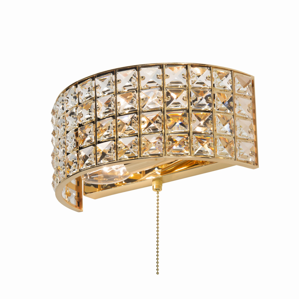 Шикарные бра из коллекции Портал станут изящным дополнением в интерьере ваших спален, гостиных, прихожих комнат или рабочих кабинетов. Стильное основание, сияющее ослепительным золотом, украшено хрустальными камнями знаменитой марки Asfour, которые способны преломлять световой поток, придавая ему неповторимые, волшебные оттенки. Светильник оснащён двумя термостойкими патронами, позволяющими использовать лампы накаливания до 60 Ватт. Если же, вы предпочитаете современные светодиодные лампы, то ограничения по мощности отсутствуют вовсе. При этом для того, чтобы хрусталь в полной мере раскрыл свои качества, желательно использовать исключительно прозрачные лампочки. Для удобства в эксплуатации в модель встроен собственный выключатель в виде золотой цепочки, в цвет самого изделия.