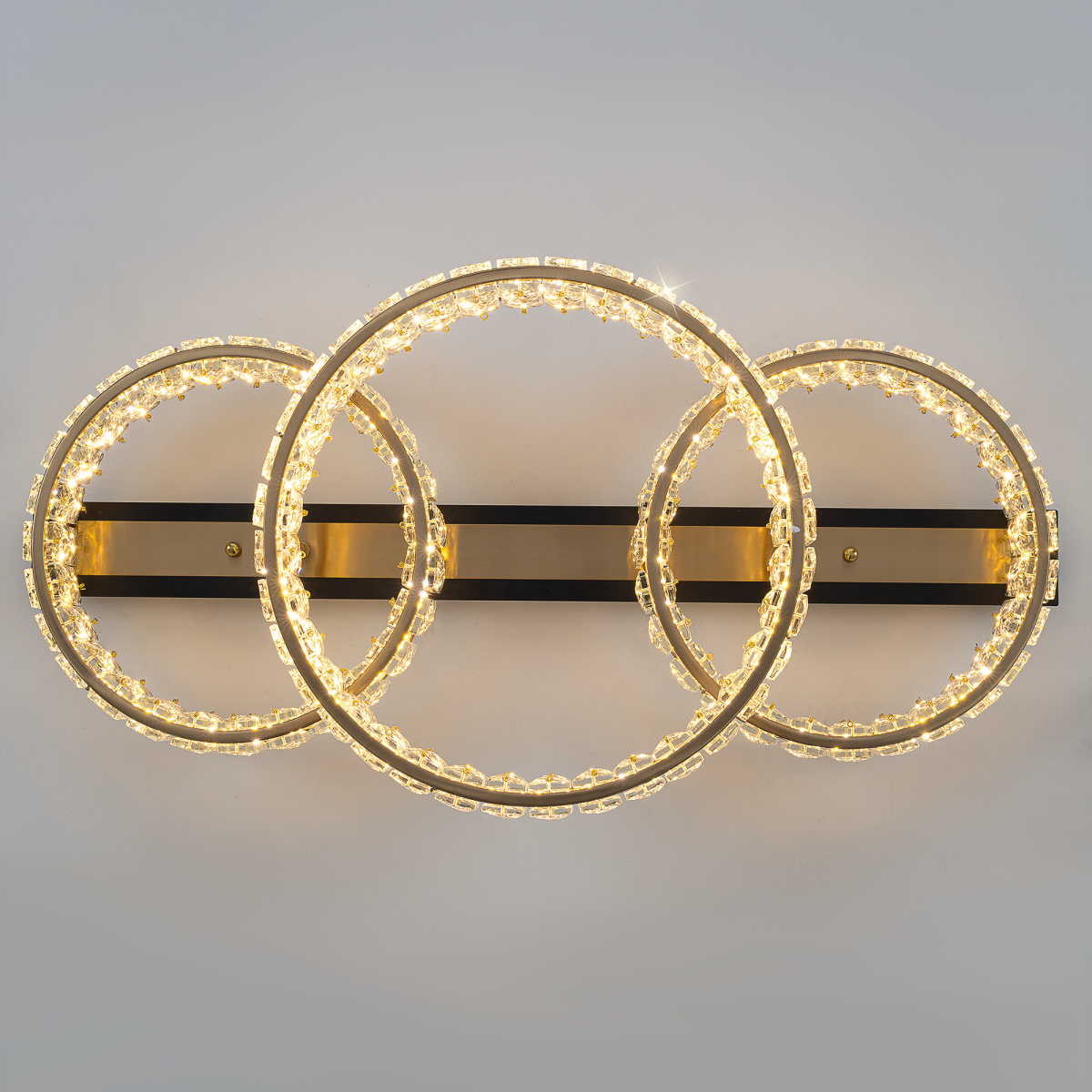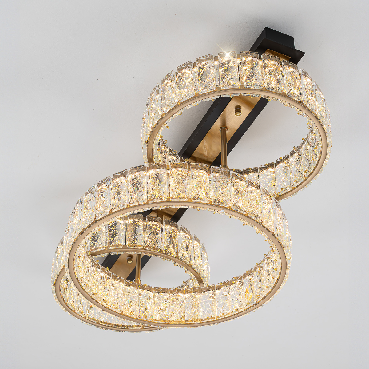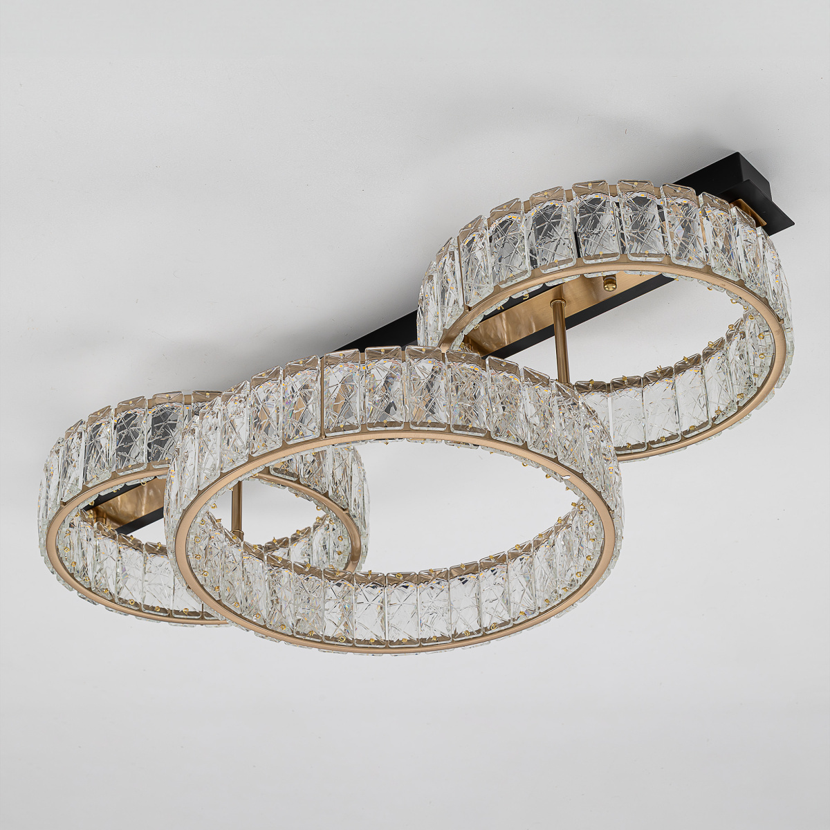 Каркас люстры — металлический, сочетаются черные и бронзовые элементы. На прямоугольном основании закреплены три кольца-модуля с хрустальным рассеивателем. Светодиодный свет с цветовой температурой 3000К мягко рассеивается в пространстве, играя на хрустальных гранях радужными искрами. Общая мощность люстры — 45Вт, ее можно установить на любой потолок, в том числе, натяжной.