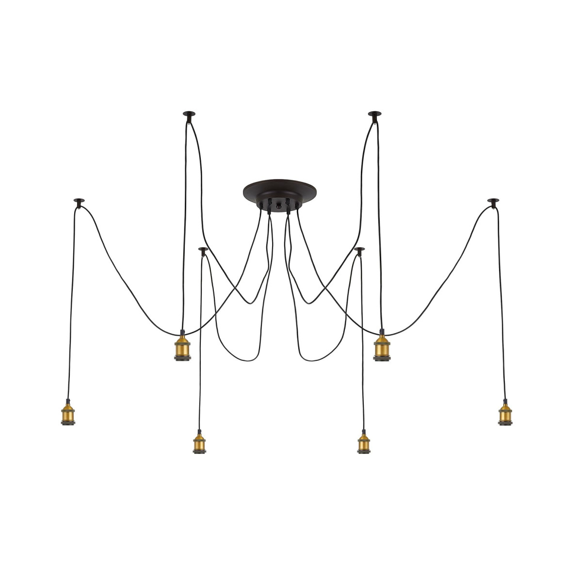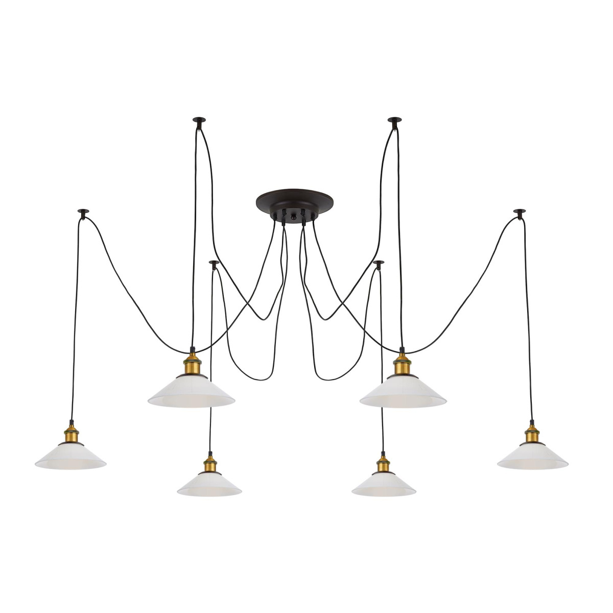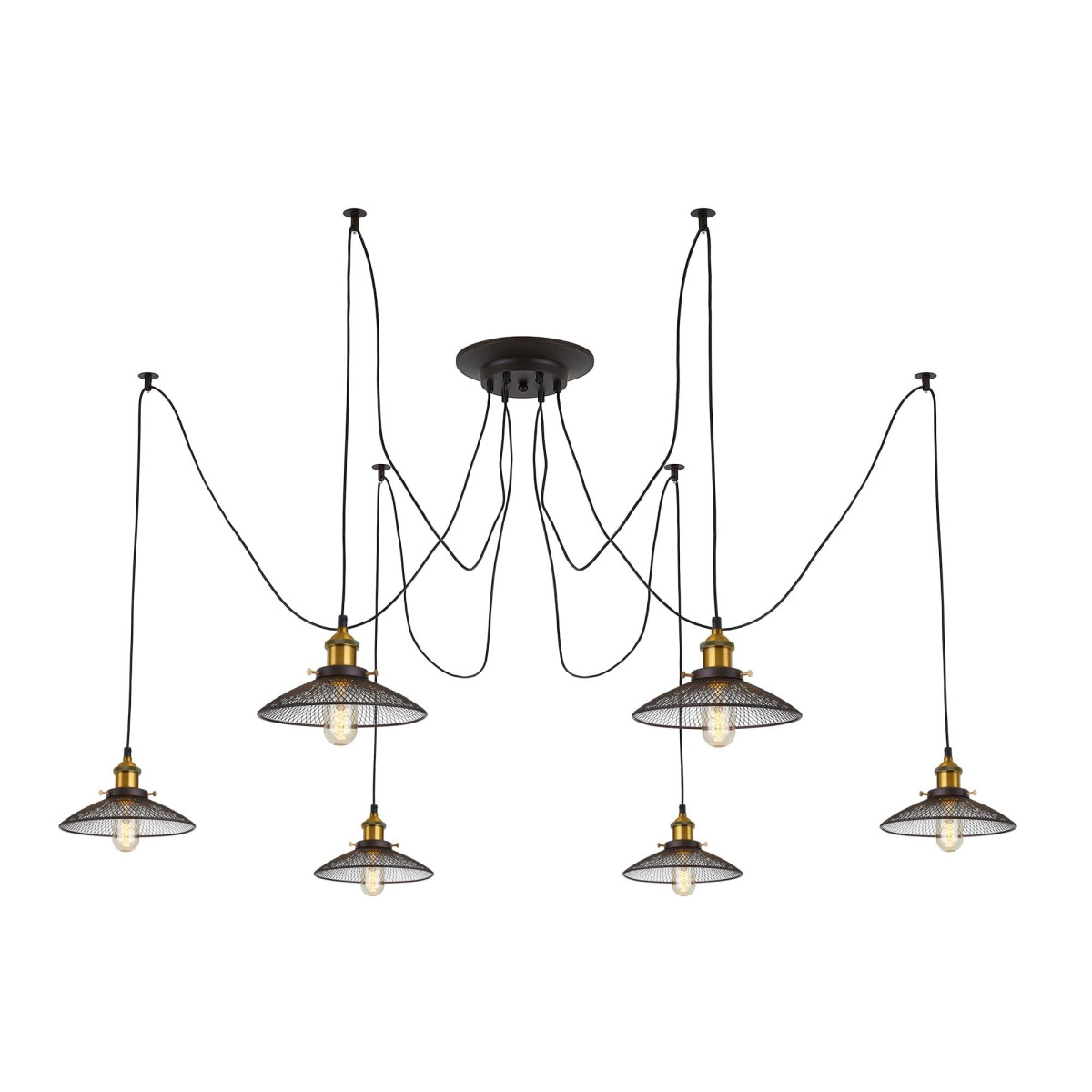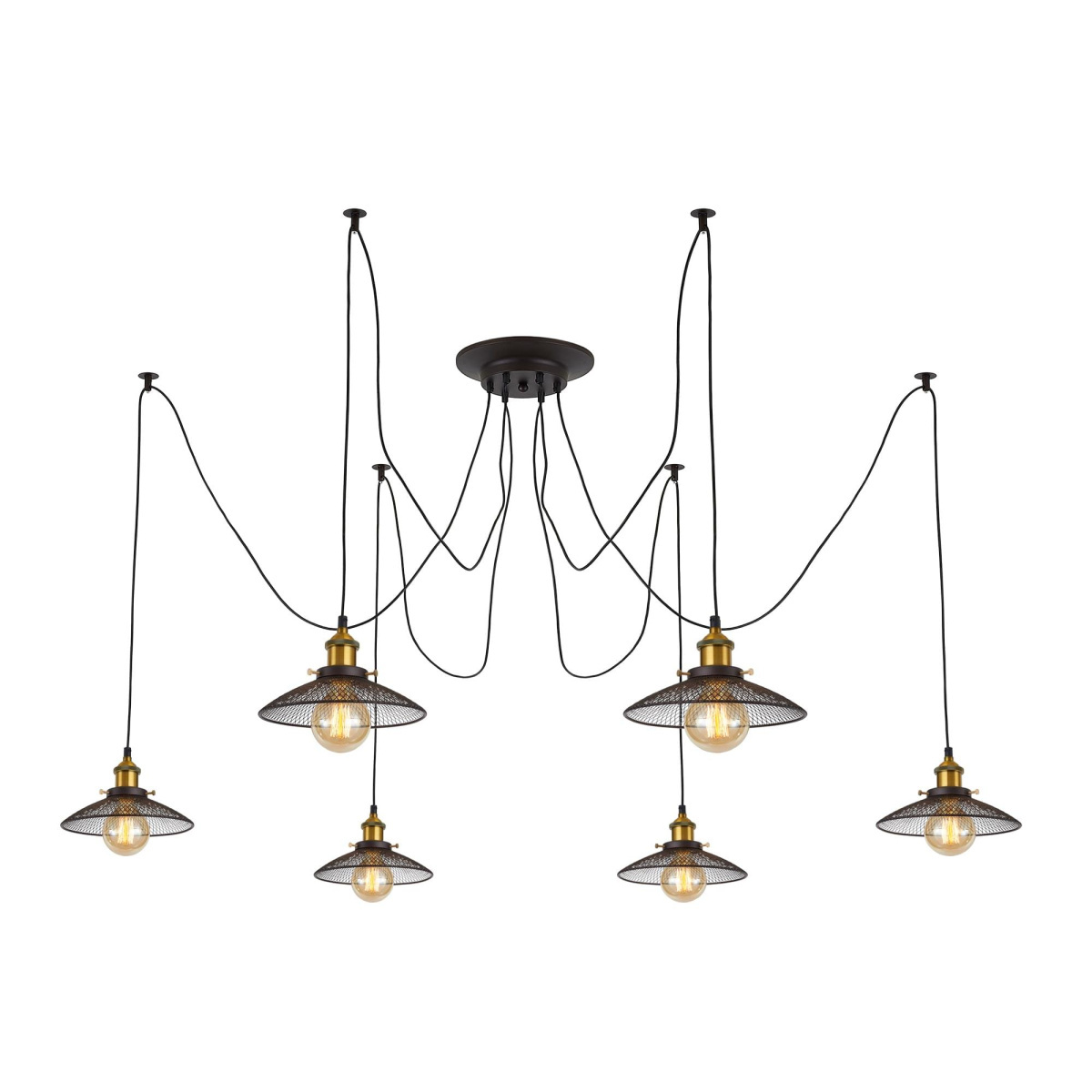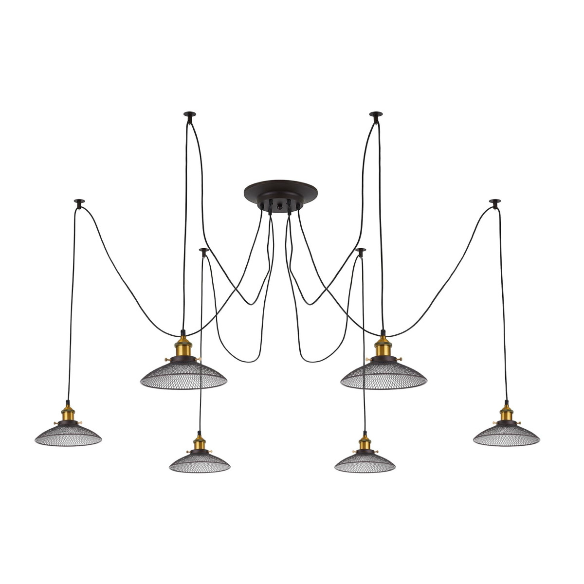 В изделии 6 ламп с цоколем Е27 максимальной мощностью для ламп накаливания 75Вт (в комплект не входят, приобретаются отдельно). Длинные провода (по 2,05м), в сочетании с дополнительным индивидуальным крепежом к потолку, позволяют при установке придать светильнику свою уникальную форму и легко адаптировать модель для высоких, стандартных и низких потолков. Тип крепления – планка.