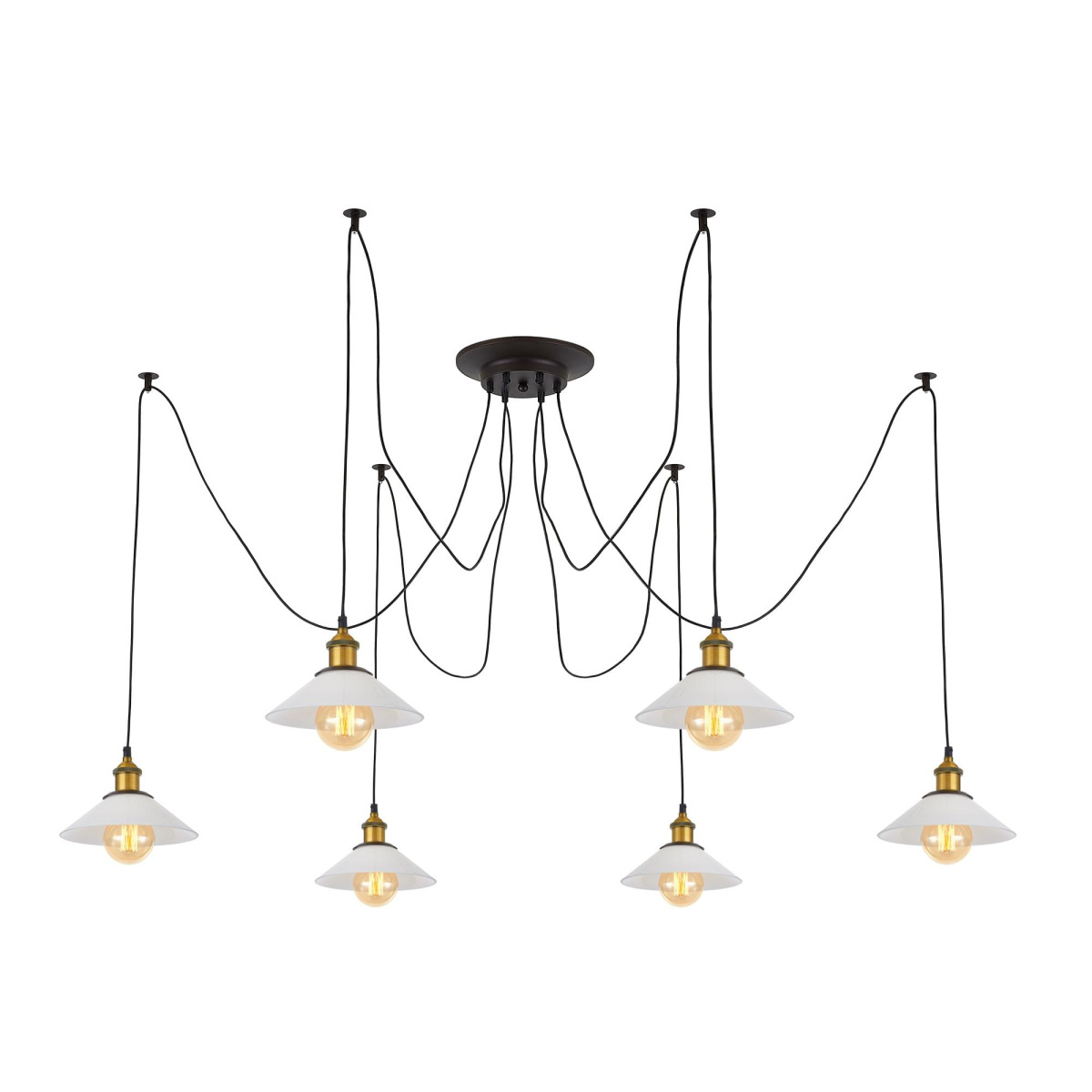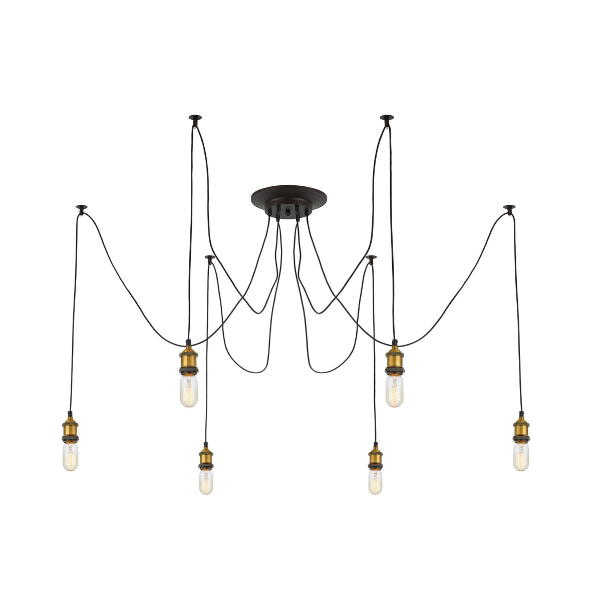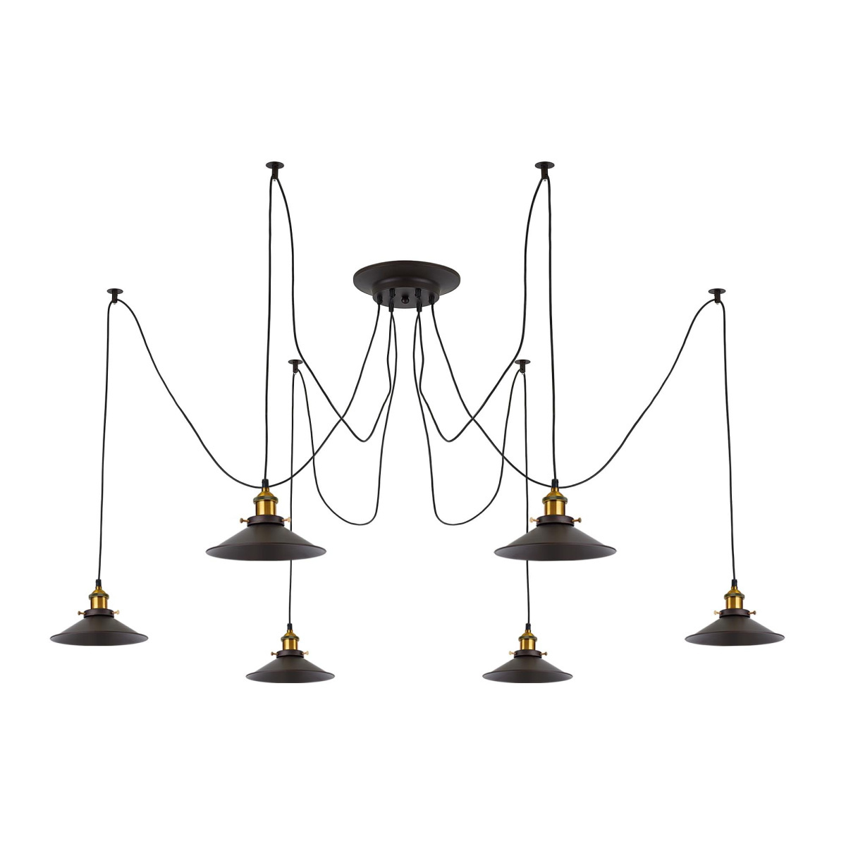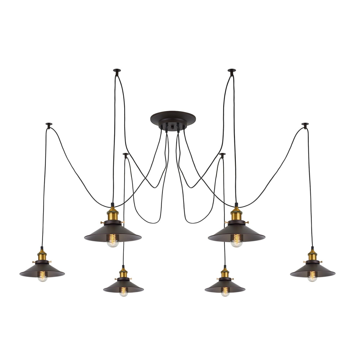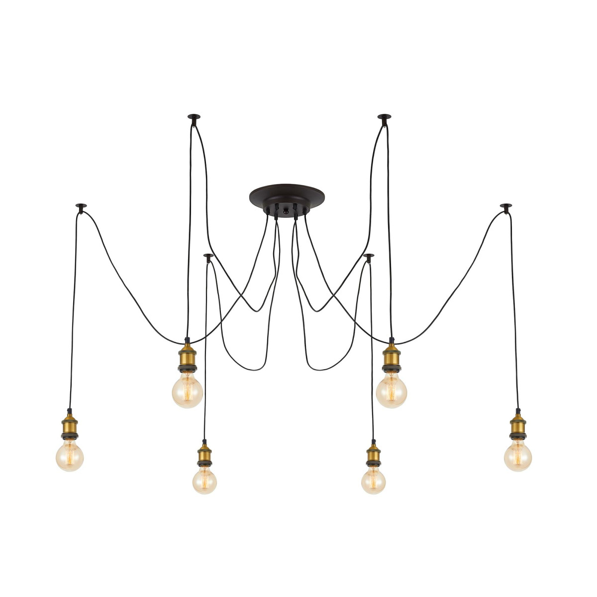 В изделии 6 ламп с цоколем Е27 максимальной мощностью для ламп накаливания 75Вт (в комплект не входят, приобретаются отдельно). Длинные провода (по 2,05м), в сочетании с дополнительным индивидуальным крепежом к потолку, позволяют при установке придать светильнику свою уникальную форму и легко адаптировать модель для высоких, стандартных и низких потолков. Тип крепления – планка.