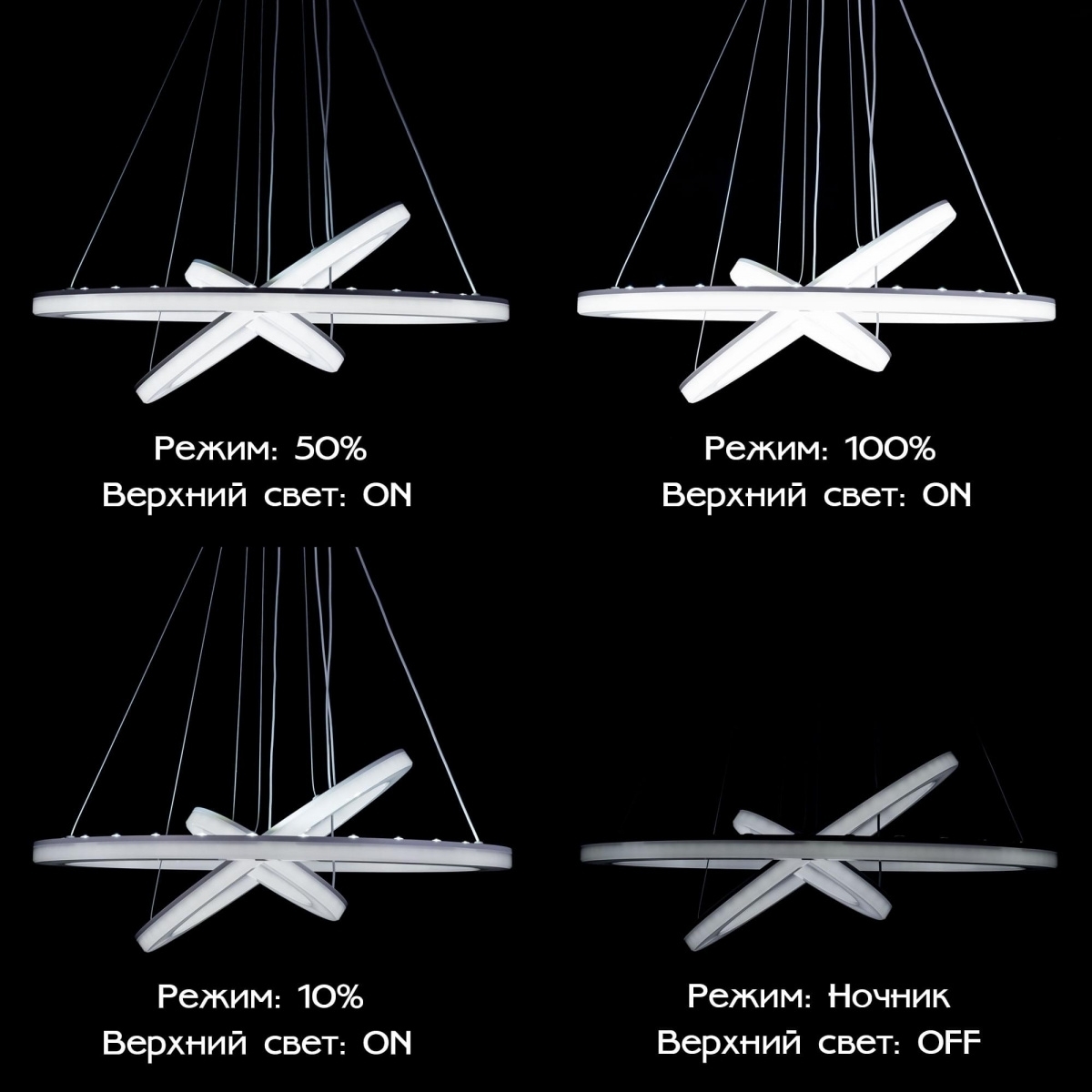 Традиционно наш светильник снабжен удобнейшим управлением с помощью обычного настенного выключателя, никакой специализированный приобретать и устанавливать не требуется. С выключателя будут срабатывать режимы, которые предварительно запрограммированы на кнопки памяти от М1 до М4 пульта управления. При первом включении, если Вы долго отсутствовали дома, всегда включится режим сохраненный на кнопке М1, если светильник выключить настенным выключателем и в течении 5 секунд включить обратно, сработает режим сохраненный на кнопке М2. Последующие аналогичные циклы переберут оставшиеся кнопки памяти.