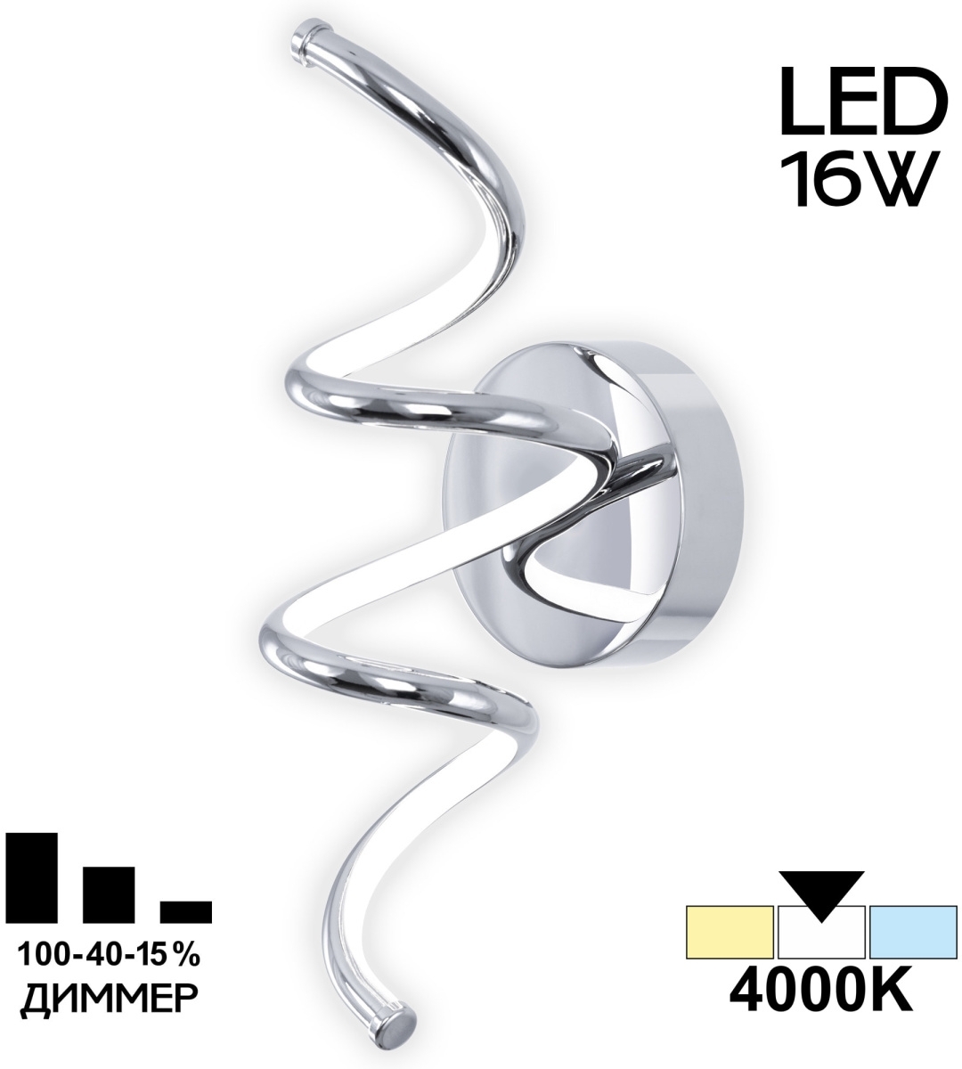 Настенный светодиодный светильник Citilux Джемини CL229331 выполнен в современном стиле. Корпус металлический, цвет хром. Рассеиватель из оптического полимера. Основание круглое, светодиодный модуль имеет форму изящно изогнутой спирали. Тип крепления к стене - планка. Изделие оснащено встроенным ступенчатым диммером с тремя уровнями яркости 100-40-15%, управляется обычным настенным выключателем. Мощность 16Вт, цветовая температура 4000К – нейтральный белый свет, безопасный для глаз, без мерцания и пульсаций. Осветит до 4м². Бра CL229331 великолепное решение для дополнительного освещения модной гостиной, уютной спальни или просторной прихожей. Светильник прекрасно выглядит как в вертикальном, так и в горизонтальном положении.