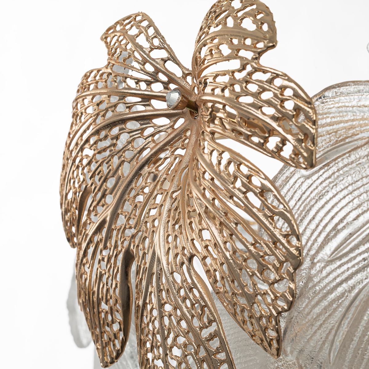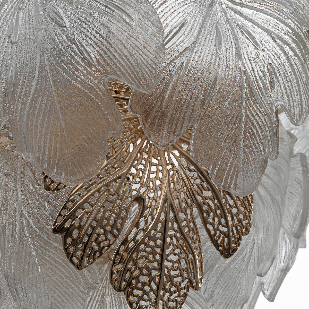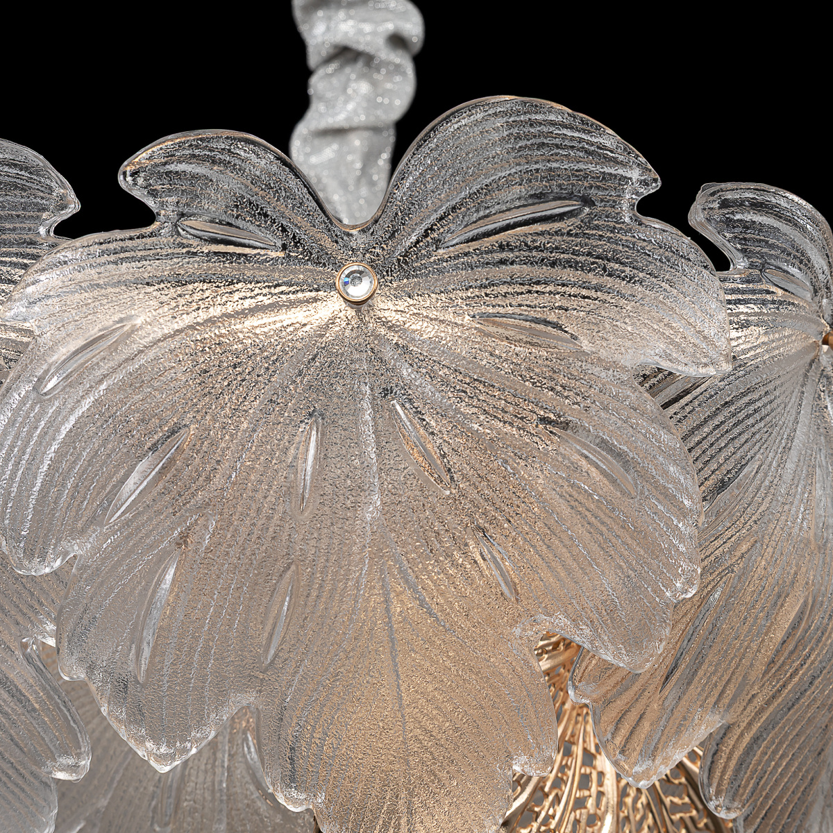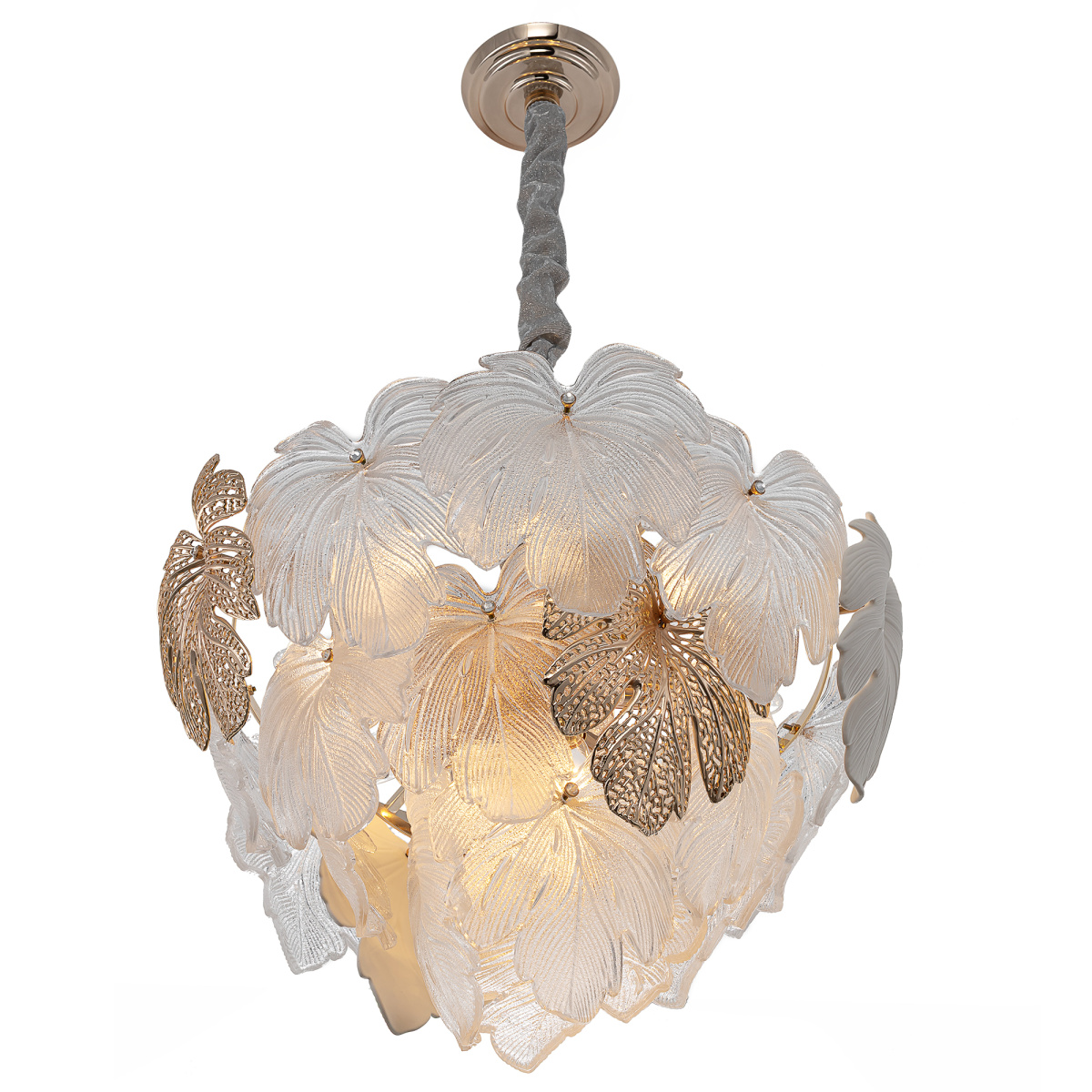 Металлический каркас благородного золотого оттенка дополняют изумительные стеклянные листья, которые формируют утонченный силуэт люстры. В люстре используются 11 лампочек с цоколем E14, максимальная мощность каждой — 60Вт для ламп накаливания. Высота люстры регулируется, ее можно установить на любой потолок, в том числе, и на натяжной.
