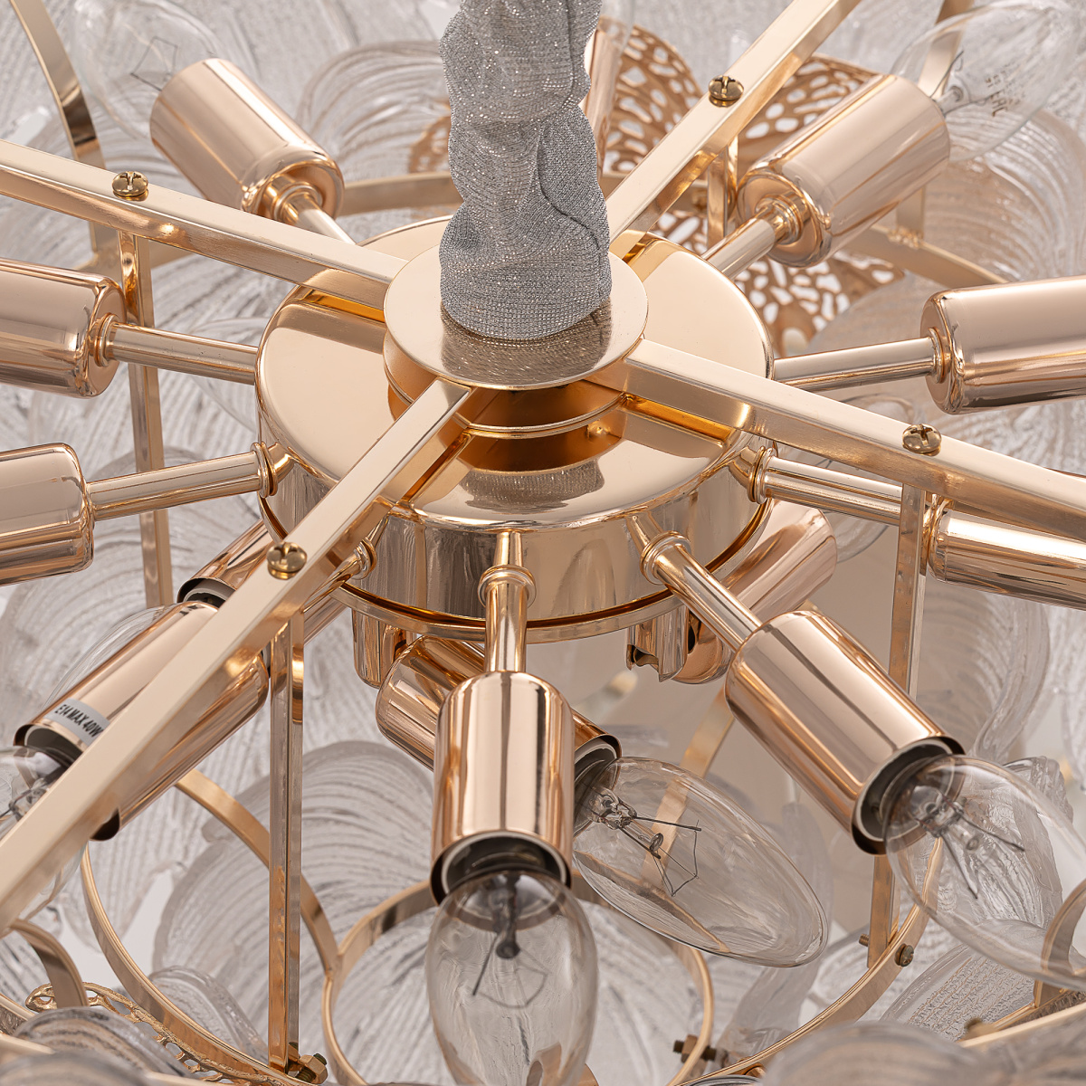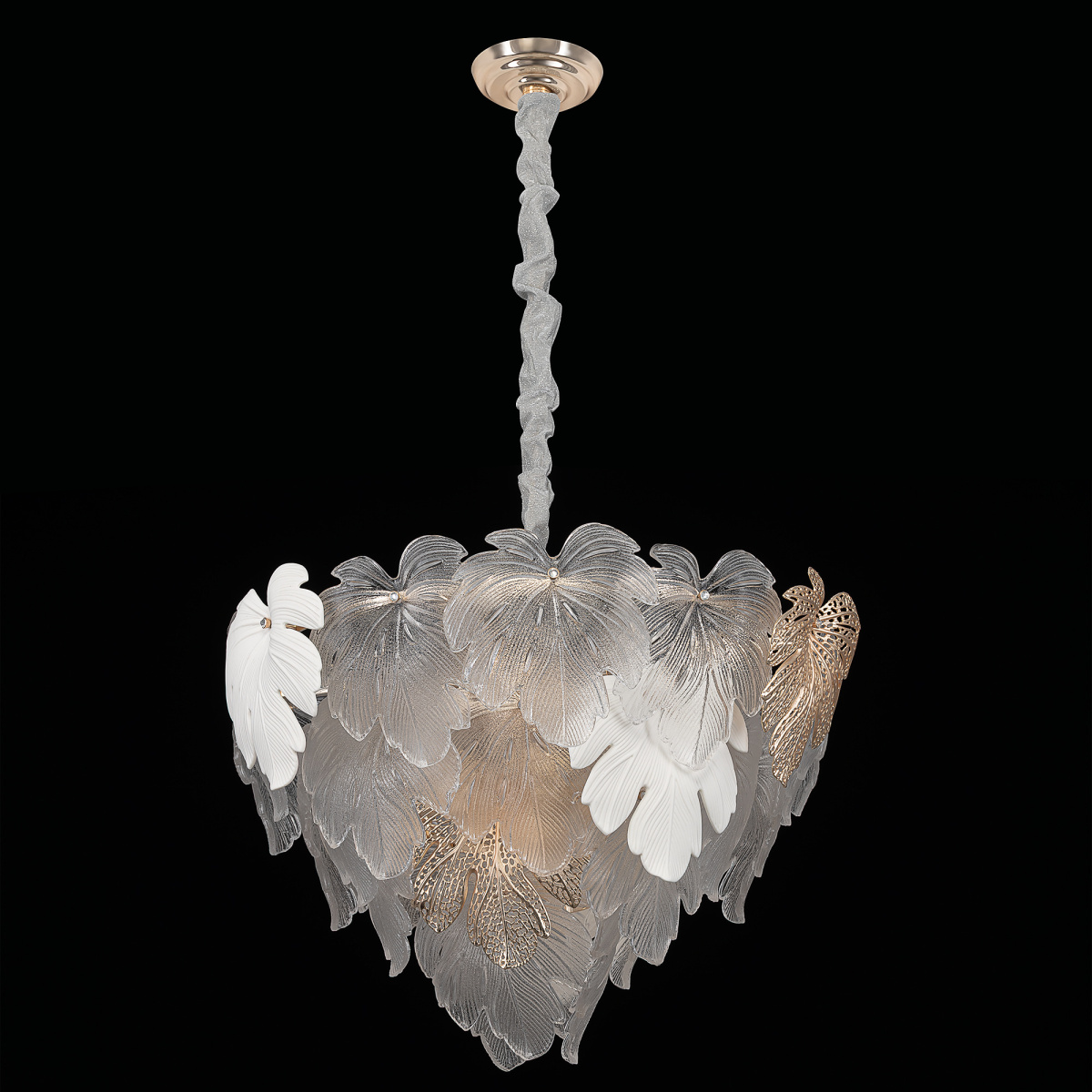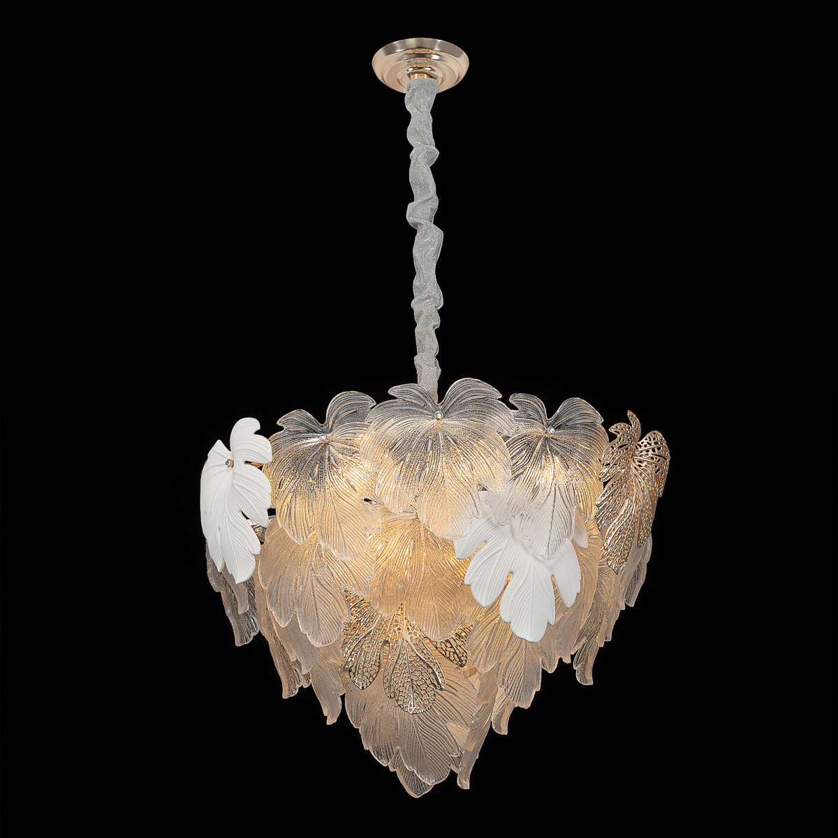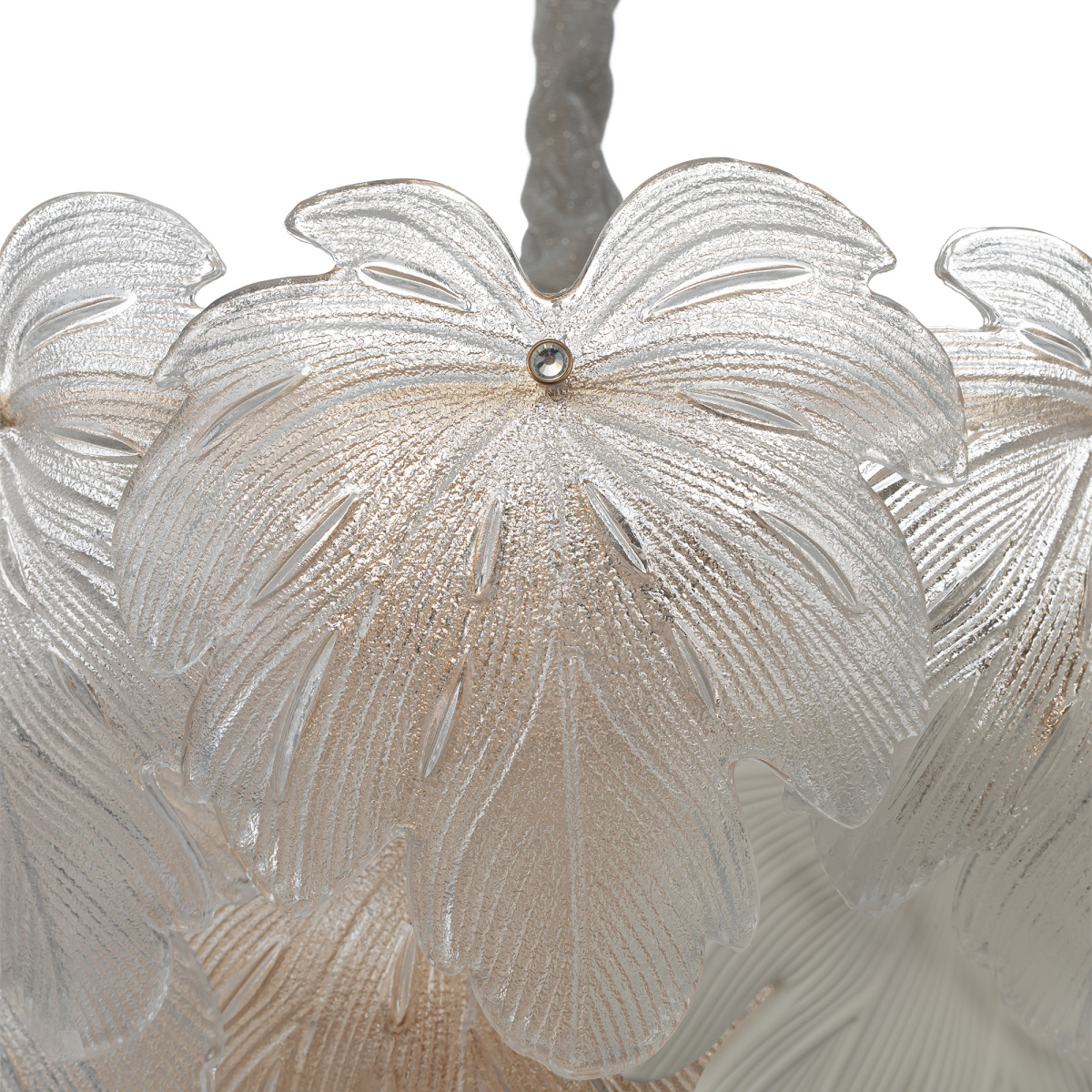 Металлический каркас благородного золотого оттенка дополняют изумительные стеклянные листья, которые формируют утонченный силуэт люстры. В люстре используются 14 лампочек с цоколем E14, максимальная мощность каждой — 60Вт для ламп накаливания. Высота люстры регулируется, ее можно установить на любой потолок, в том числе, и на натяжной.