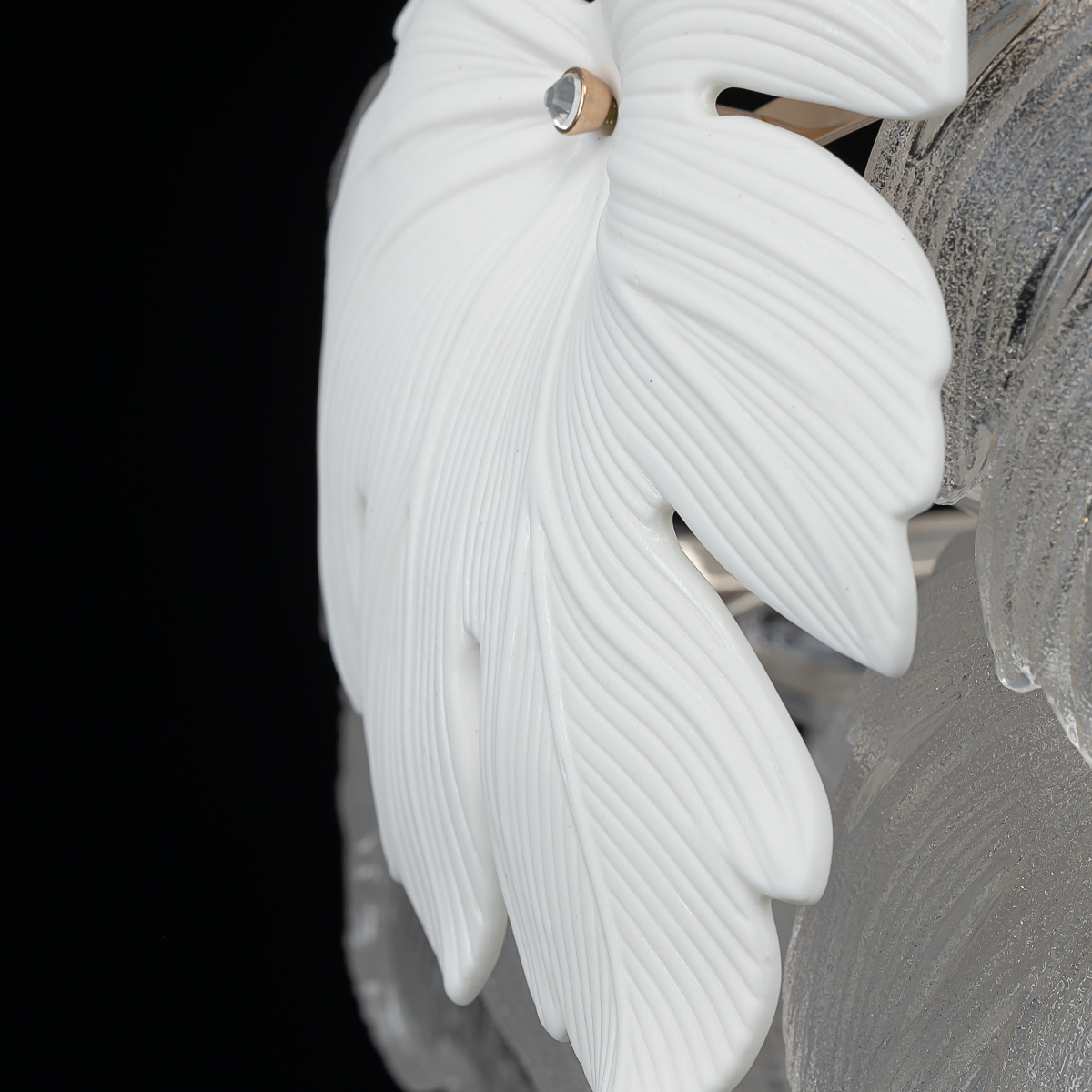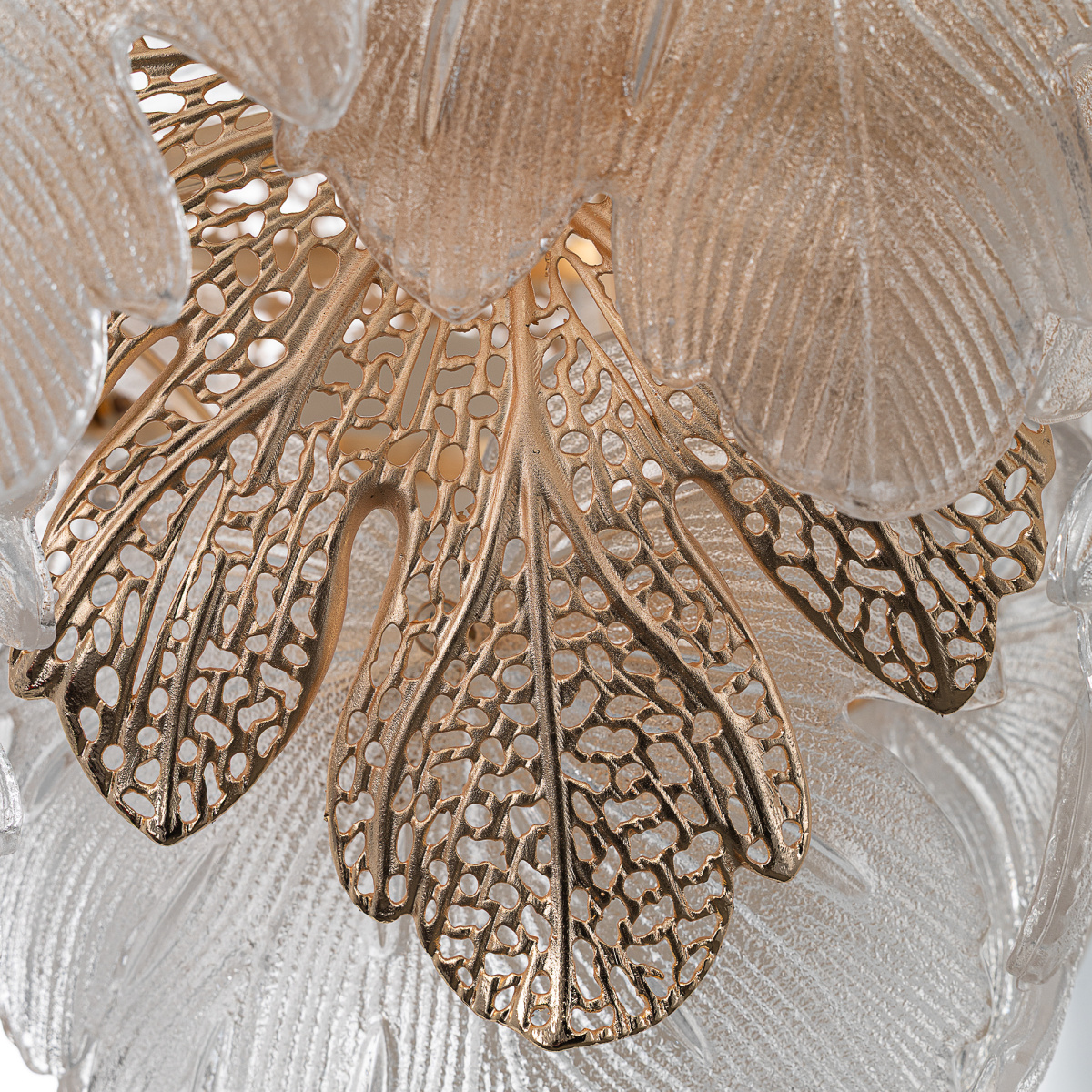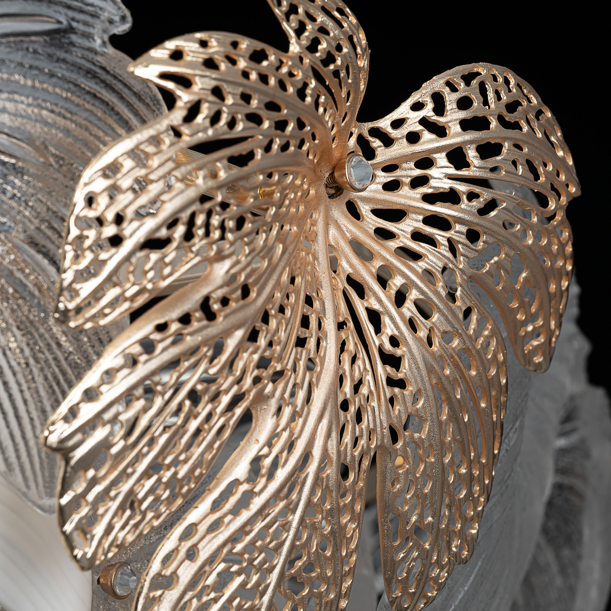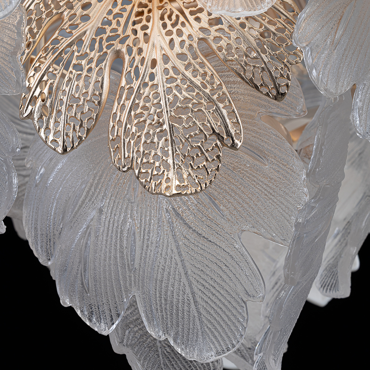 Металлический каркас благородного золотого оттенка дополняют изумительные стеклянные листья, которые формируют утонченный силуэт люстры. В люстре используются 14 лампочек с цоколем E14, максимальная мощность каждой — 60Вт для ламп накаливания. Высота люстры регулируется, ее можно установить на любой потолок, в том числе, и на натяжной.