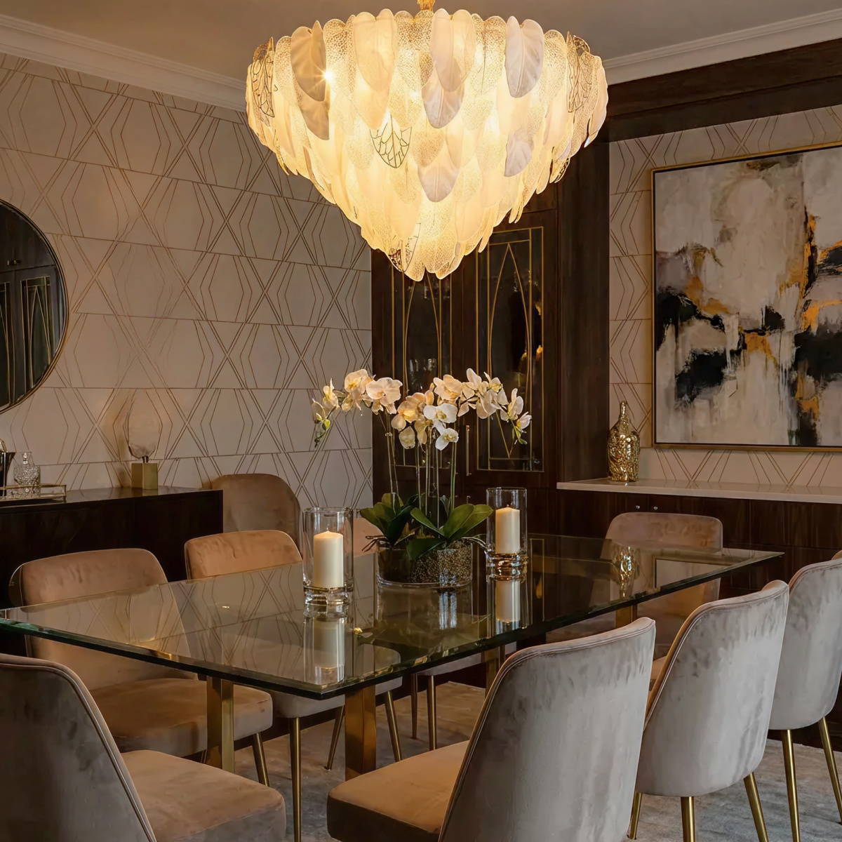 Металлический каркас золотистого оттенка переливается в лучах света. Листья из полуматового и прозрачного рифленого стекла, белой керамики, а также металлические листья с прожилками, отлитые по ювелирной технологии, подчеркивают флористическую изысканность и четкость силуэта люстры. В изделии используются 29 лампочек с цоколем Е14, высоту подвесной цепи можно отрегулировать.