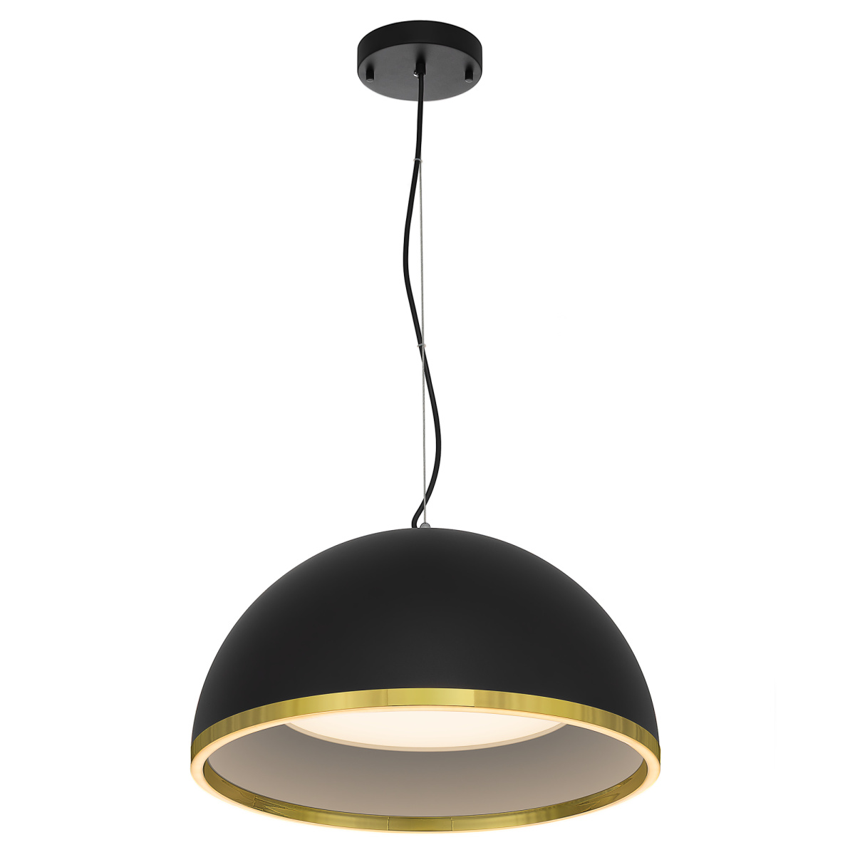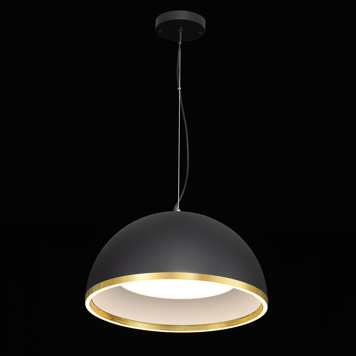Корпус светильника из металлического сплава, модного черного оттенка, дополненный стильной золотой окантовкой по краю полусферического плафона. Рассеивателем служит оптический полимер.