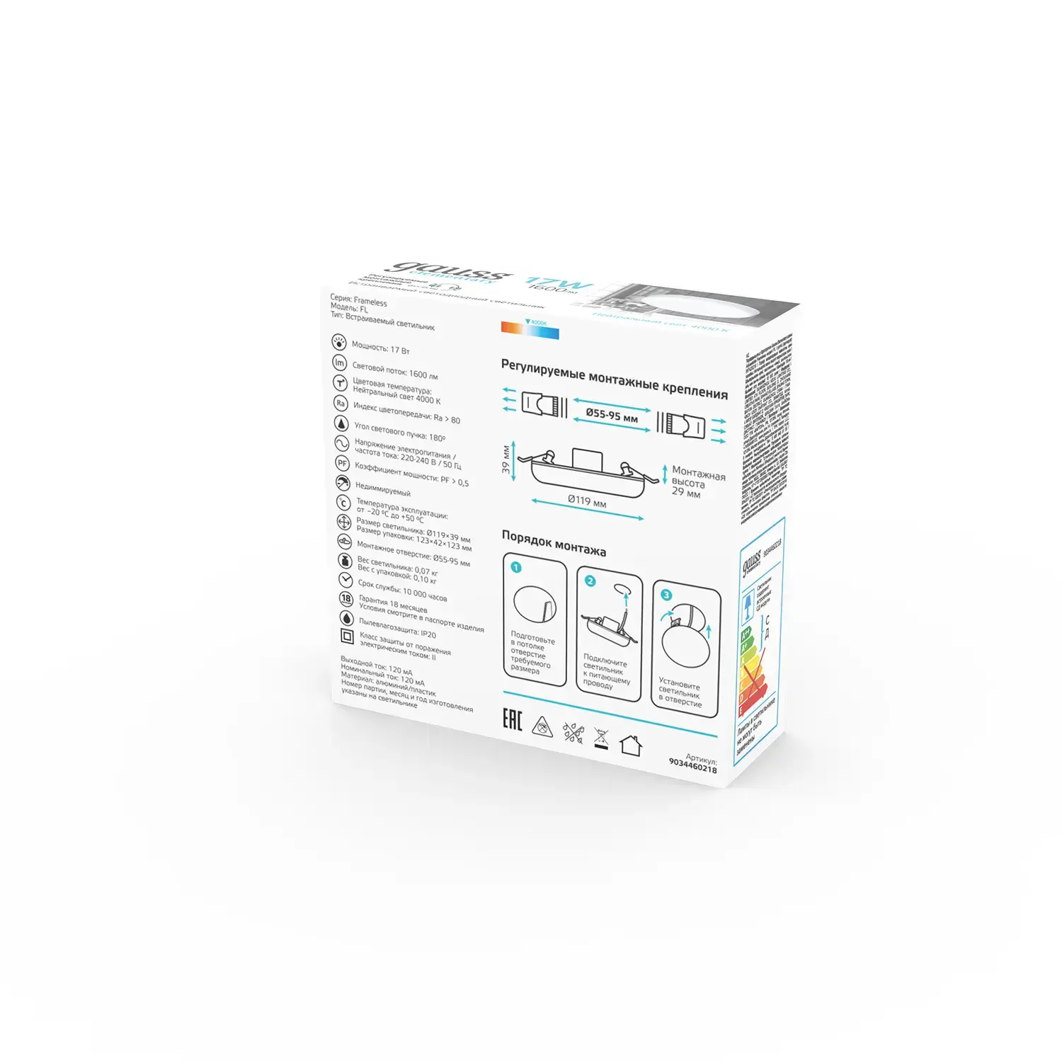 Встраиваемый светодиодный светильник 17W 4000K 9034460218 белый Elementary Adjustable Frameless Gauss