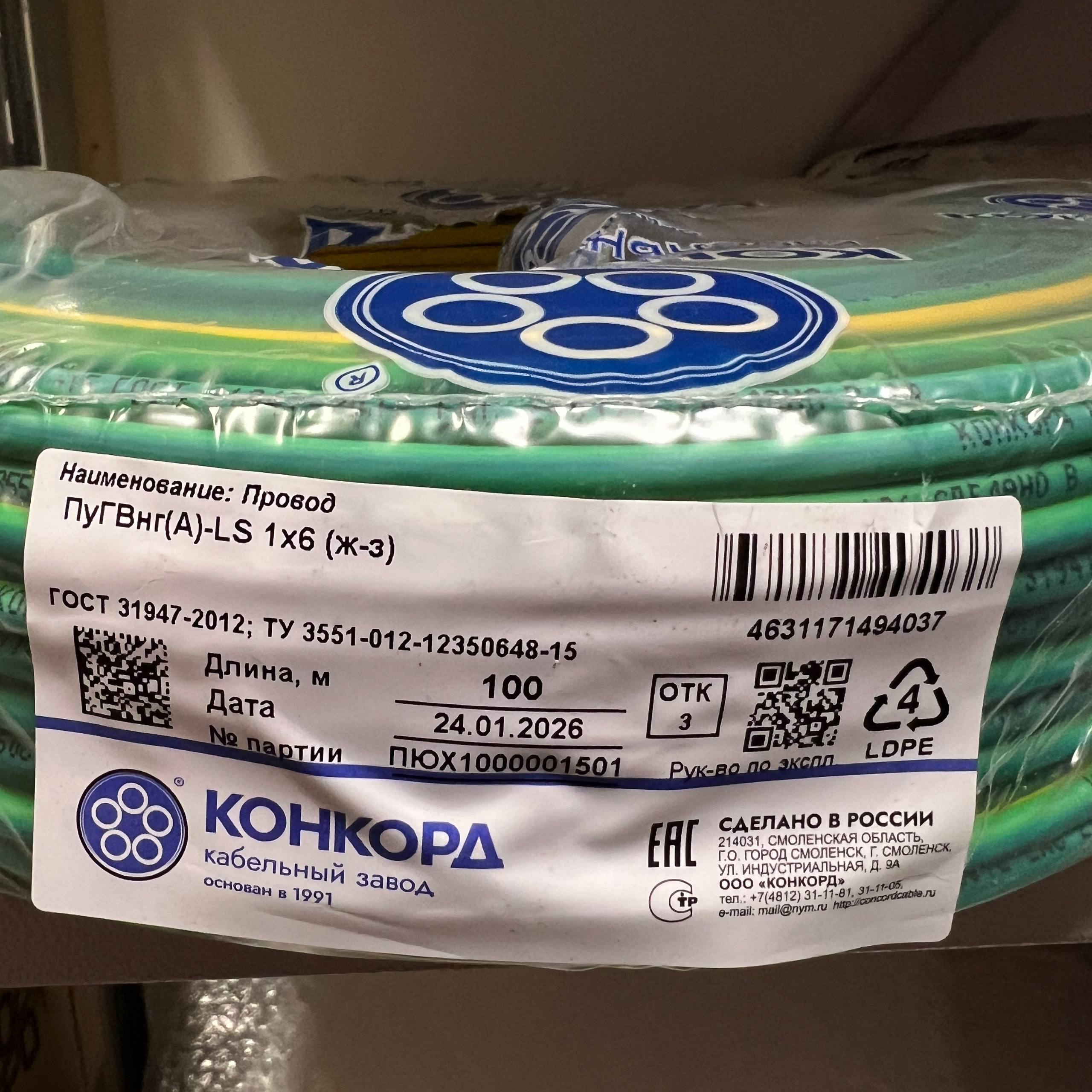 Провод ПуГВнг(А)-LS (ПВ-3) 1х 6 ГОСТ желто-зеленый Конкорд