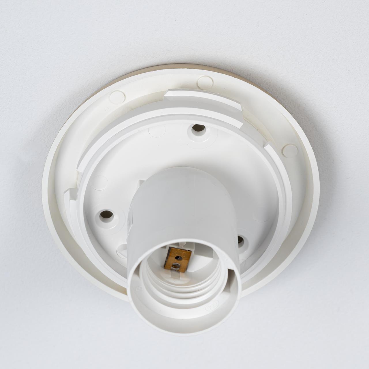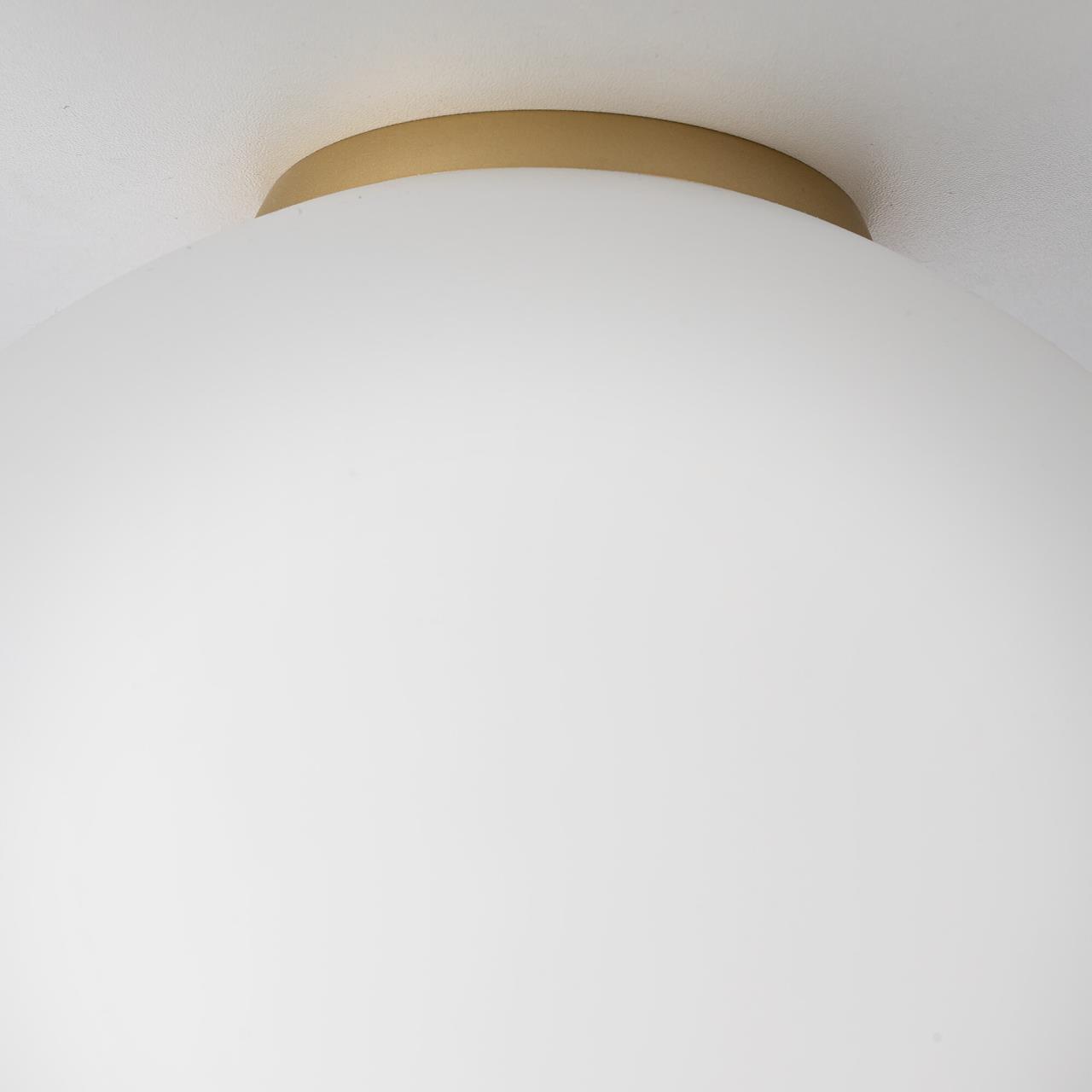 На золотистом основании высотой 12мм из высокопрочного полимера располагается белый матовый плафон-сфера диаметром 25см, изготовленный из специализированного оптического полимера. В изделии используется одна светодиодная лампочка с цоколем Е27. Благодаря форме и фактуре плафона светильник освещает пространство мягким и уютным заливным светом.
