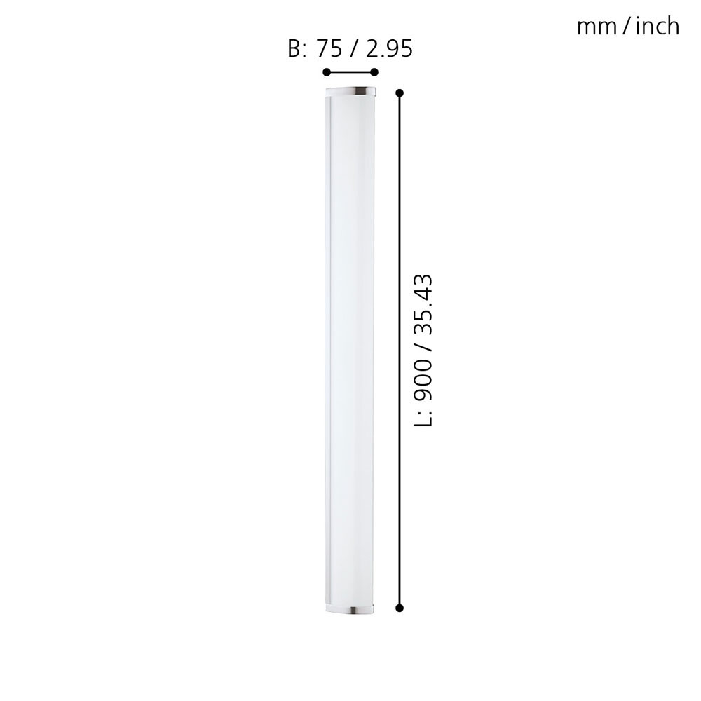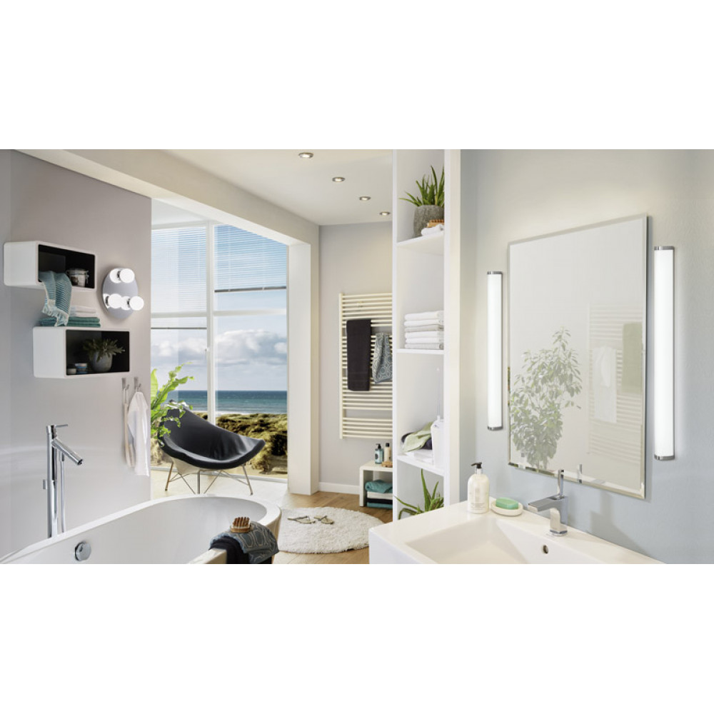 Выполненный из хромированного металла и белого пластика, прибор обеспечивает равномерное освещение, поэтому идеально подойдет для подсветки зеркал.