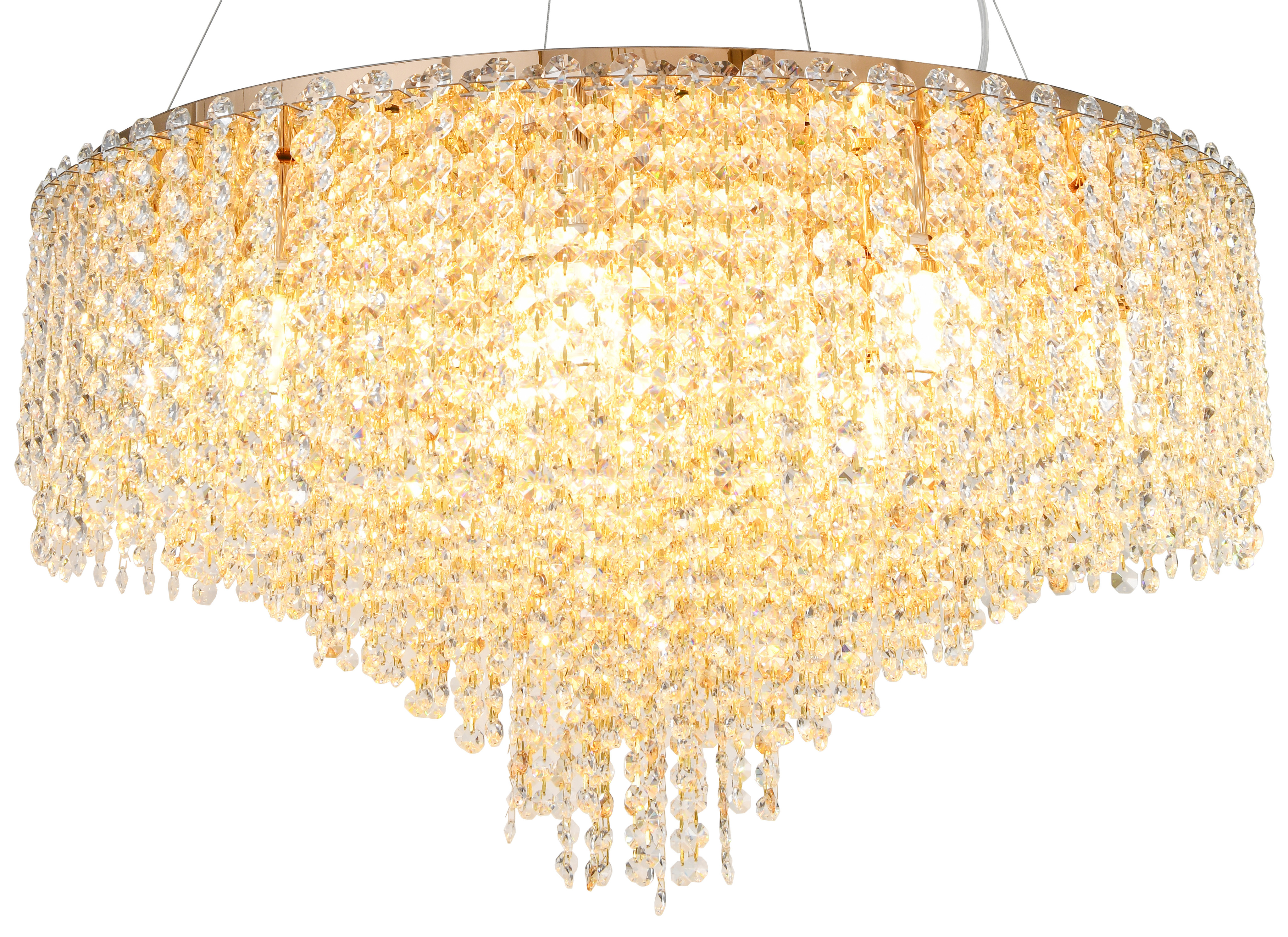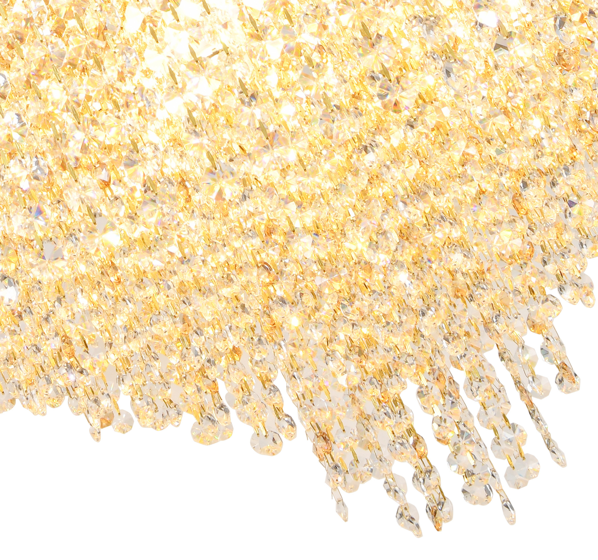 Люстра подвесная коллекции Rain of Crystal выполнена из металла, гальванизированного в цвет золота, и декорирована прозрачным и янтарным хрусталем. Особенностью данной коллекции является возможность использовать её как в подвесном, так и в потолочном варианте. На верхней части люстры установлен декоративный лист из нержавеющей стали, отполированный до зеркального блеска, который скрывает технические элементы и позволяет устанавливать её в лестничных проёмах и помещениях со вторым светом. Высокое качество и неповторимый дизайн светильника идеально подойдут как для классических, так и для современных интерьеров. Из данной коллекции светильников можно сделать индивидуальный заказ любого цвета и размера.