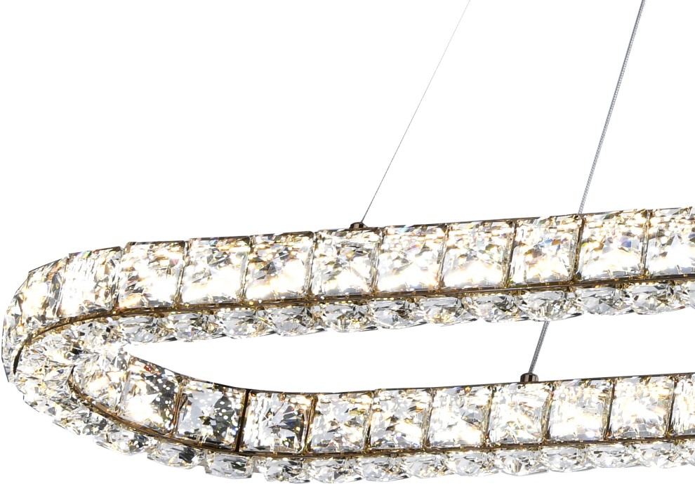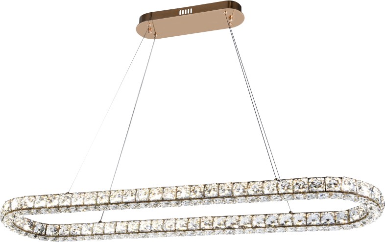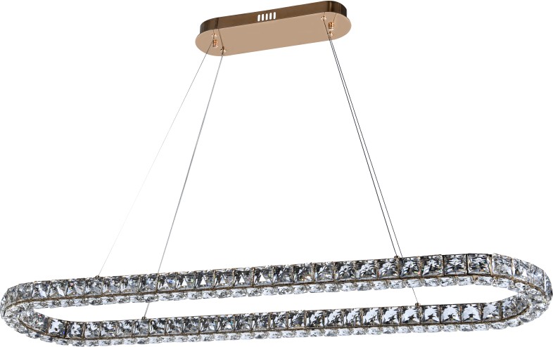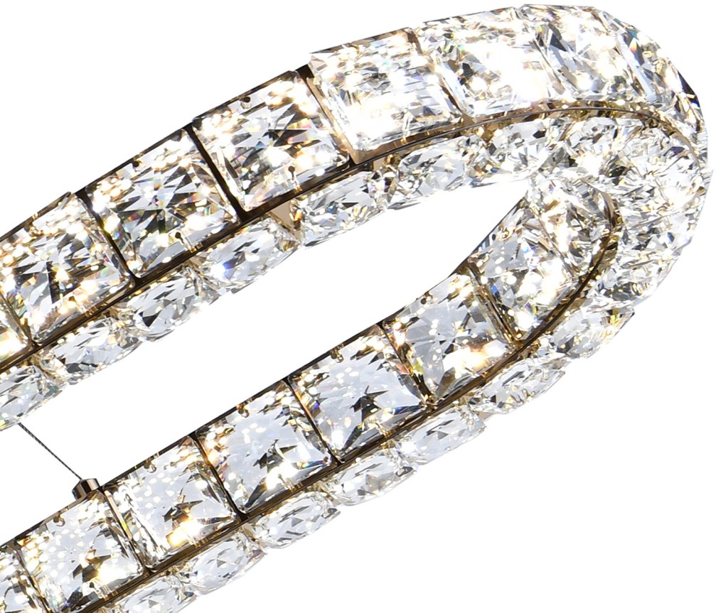 Подвесная люстра вытянутой формы коллекции UltraTon выполнена из металла, гальванизированного в цвет золото, и декорирована хрусталем высшей категории К9. В комплекте - пульт дистанционного управления 2.4G и высококачественный драйвер европейского стандарта TÜV, обеспечивающий переключение трех режимов световой температуры и диммирование. Люстра изготовлена с учетом современных тенденций минимализма: её толщина составляет 4 сантиметра. Высокое качество и уникальный дизайн идеально подойдут для классических и дизайнерских интерьеров.