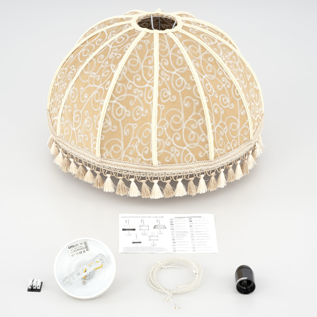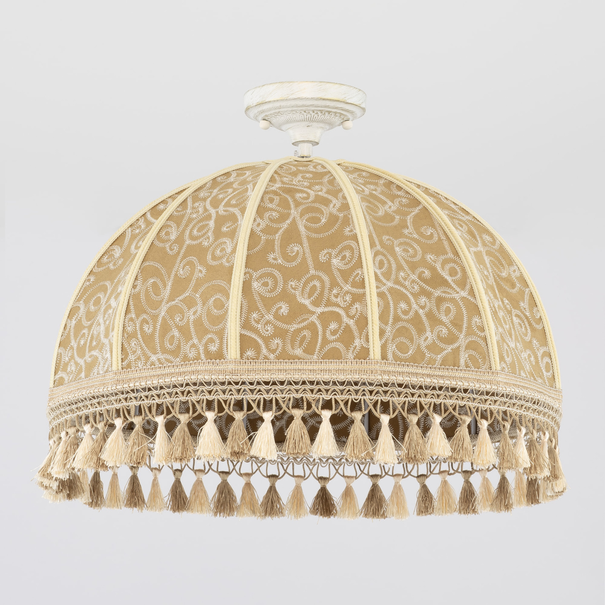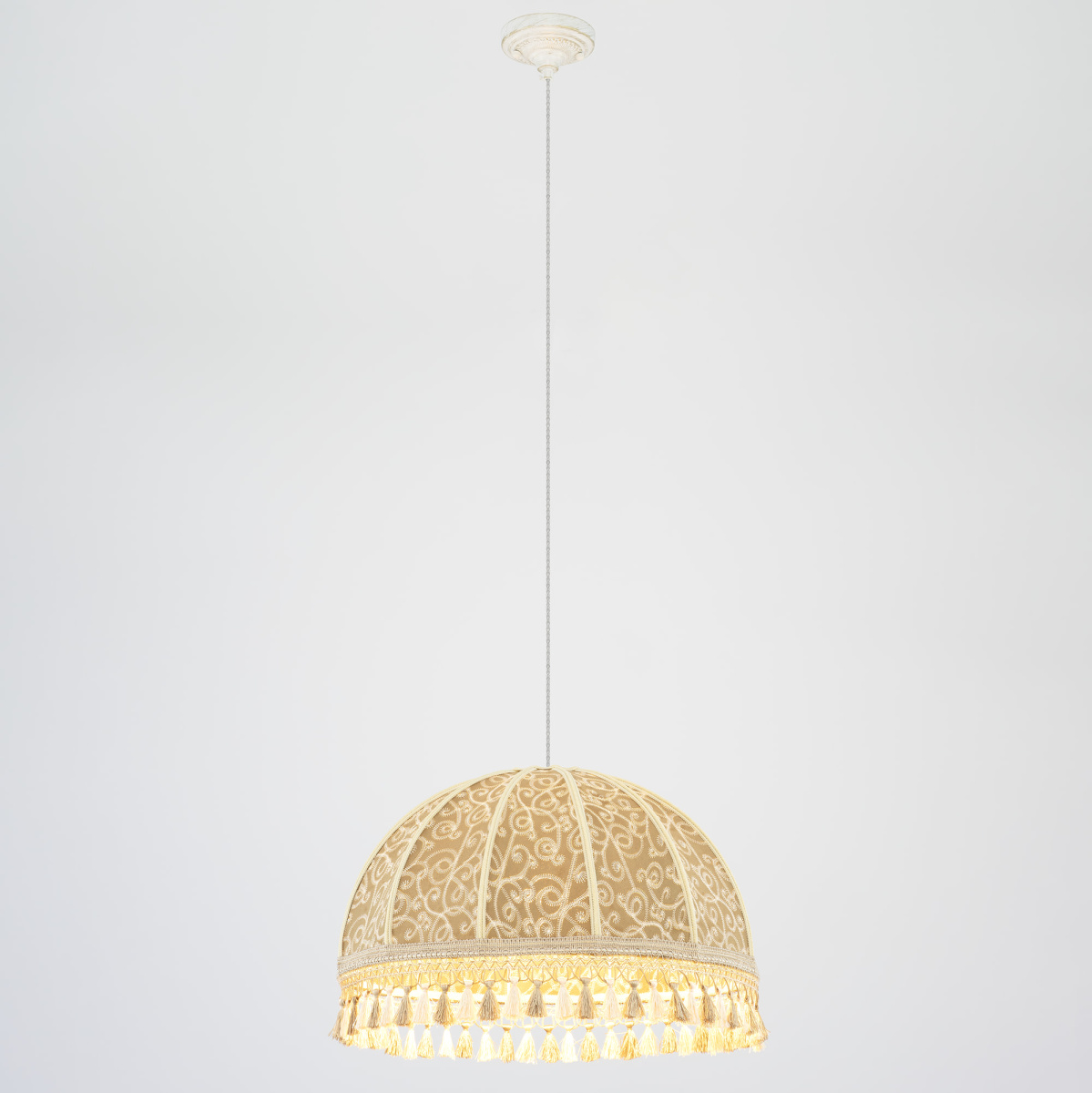 Уютный подвесной светильник Citilux Базель CL407025 выполнен в классическом стиле. Потолочное основание металлическое, молочного цвета с благородной золотистой патиной, украшено искусным орнаментом. Абажур тканевый, цвета капучино декорирован оригинальной вышивкой и обшит бахромой.