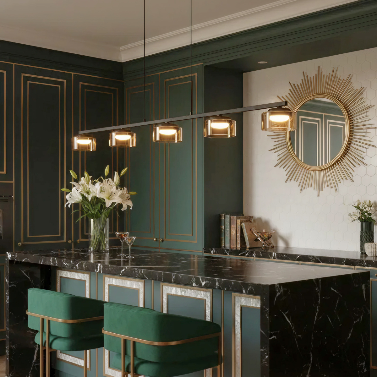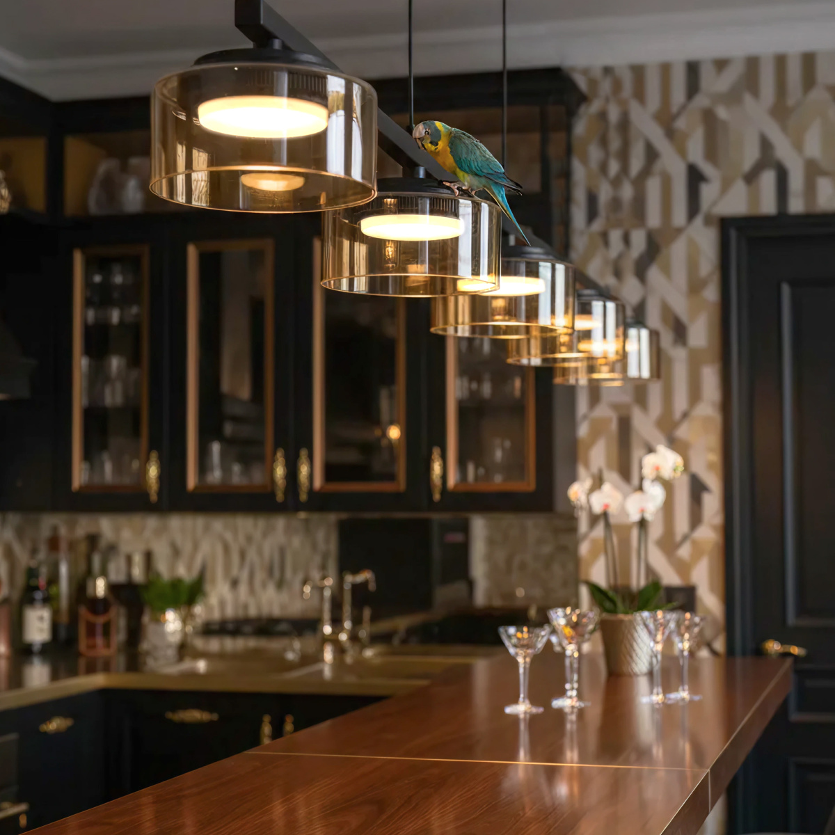 Черный металлический каркас придает светильнику сдержанности, а стеклянные открытые плафоны в форме цилиндра с тонировкой оттенка шампань создают игру света и тени, наполняя пространство мягким рассеянным светом.