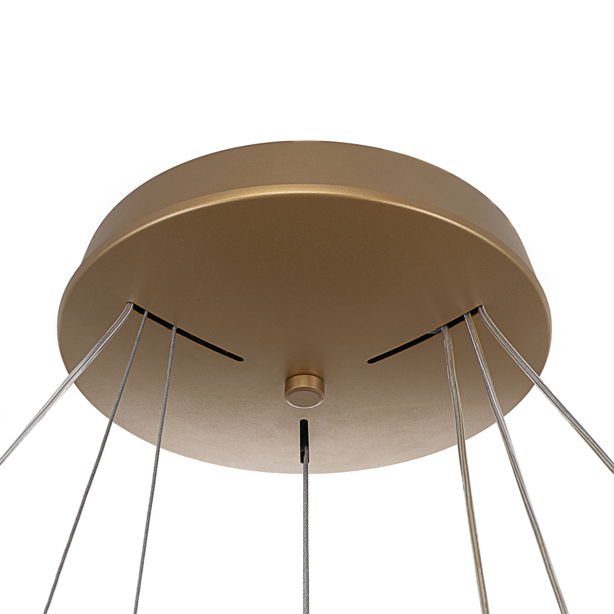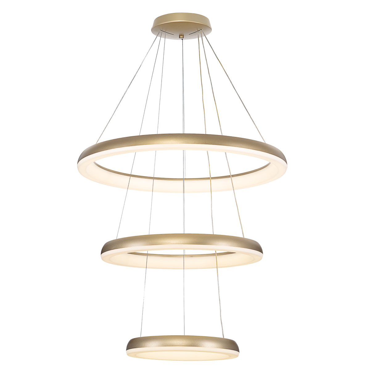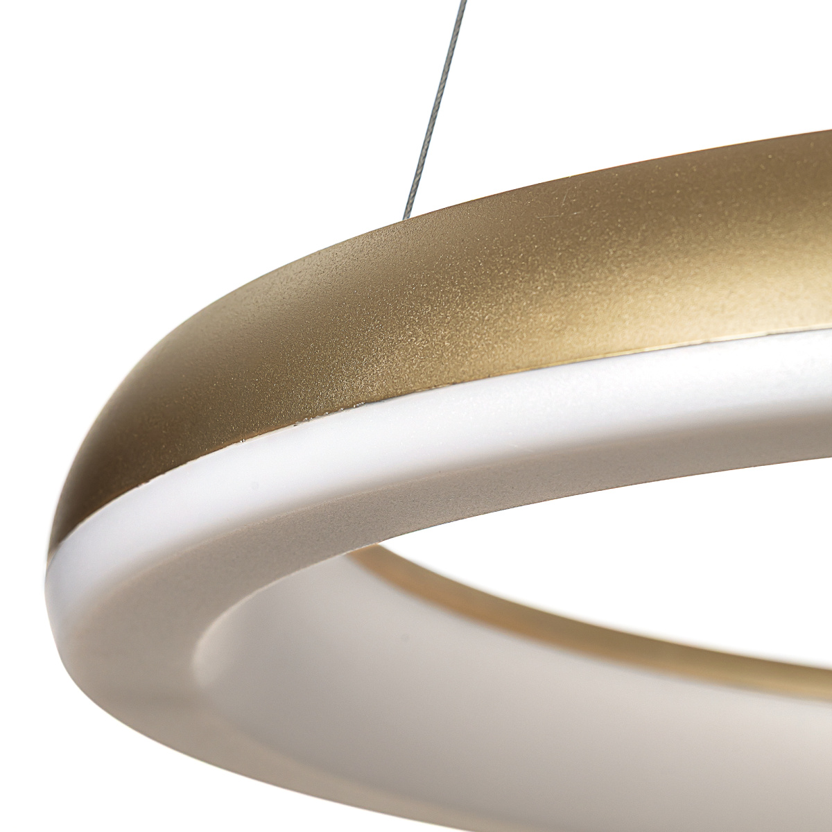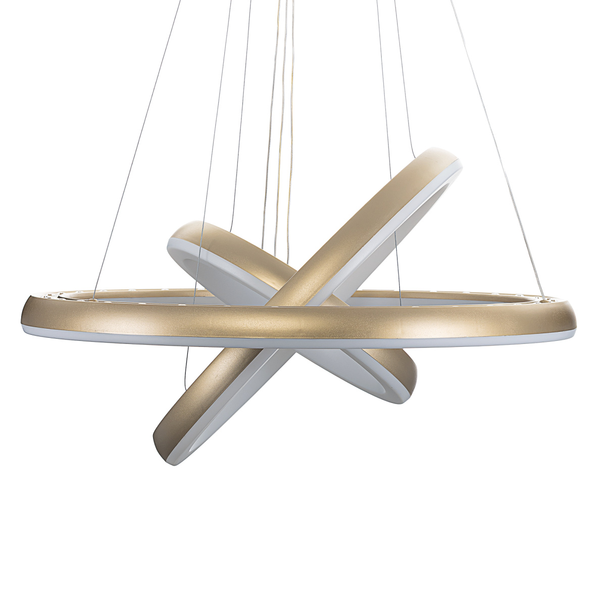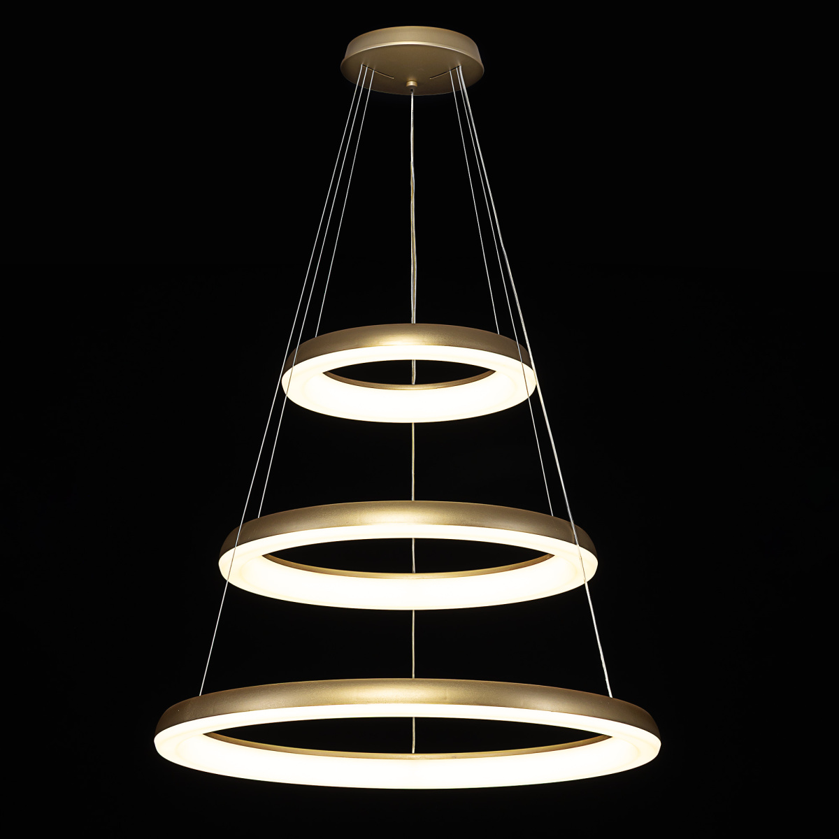Люстра на тросах в форме каскада из трех подвесных колец, высоту и угол наклона каждого из которых можно изменить. Корпус изготовлен из прочного полимера золотистого оттенка, рассеиватель — оптический полимер. Крепление люстры подходит для всех типов потолков, в том числе натяжных. Тип крепления — планка. Суммарная мощность светильника 170Вт, световой поток 12500Лм.