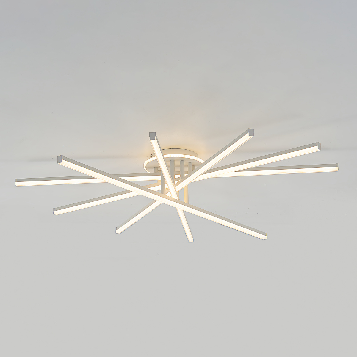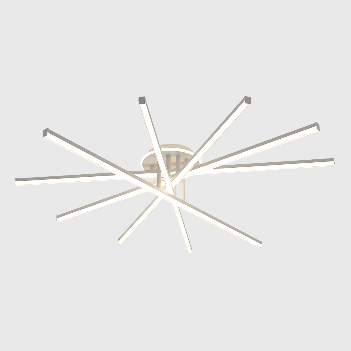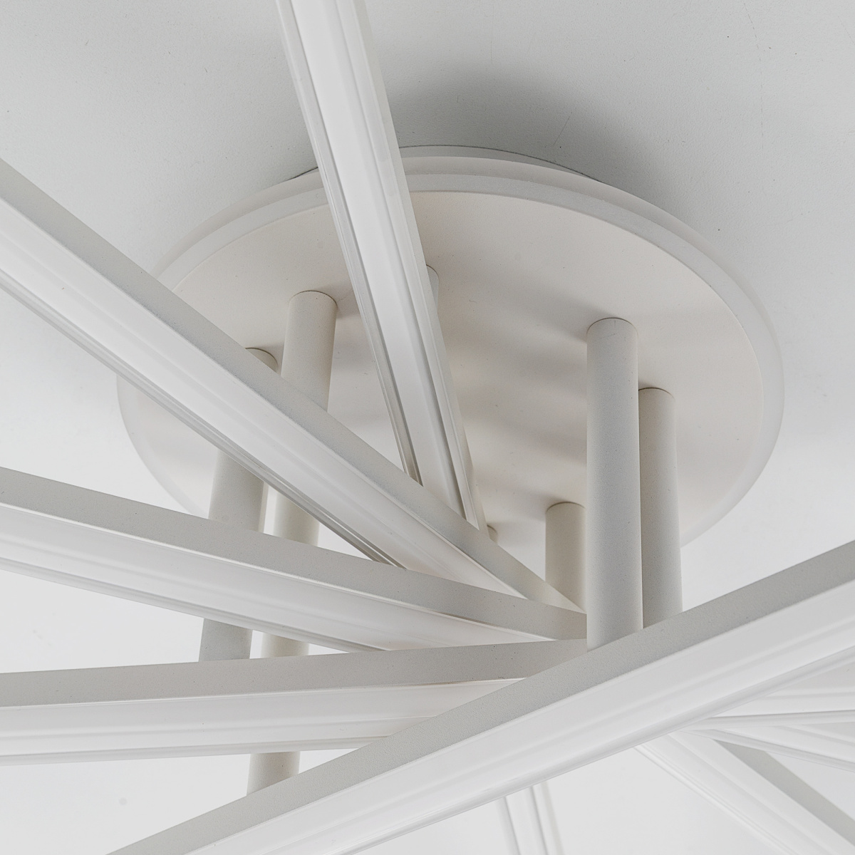 Корпус люстры — из металлического сплава, окрашенного белой краской. Глянцевый рассеиватель — из специализированного оптического полимера. У люстры есть изящная подсветка потолка.