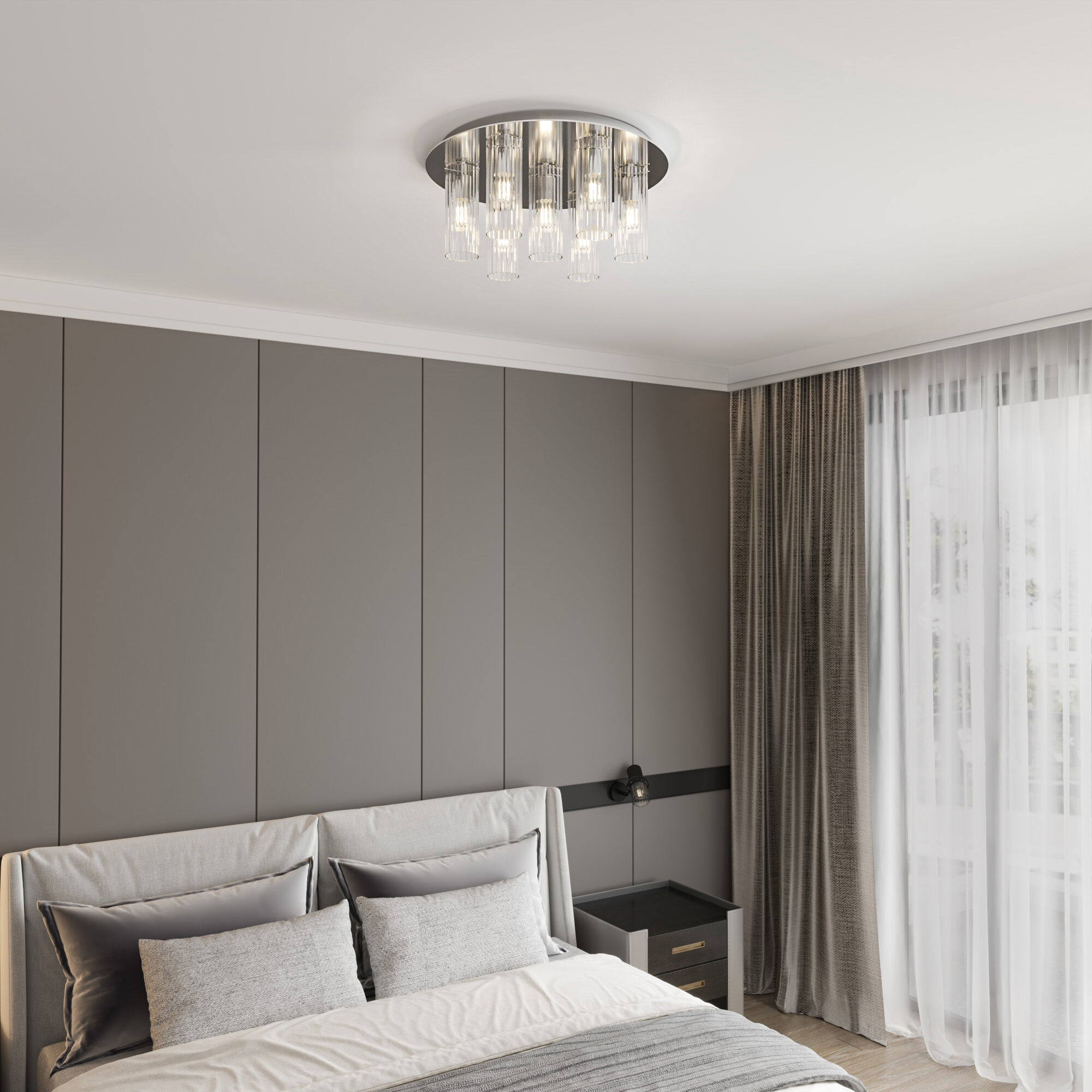 Потолочная люстра из коллекции Merge предназначена для создания основного освещения в доме. Хромированная потолочная чаша придаст помещению ощущение изысканности и утончённости, отражая световые блики, создающие эффект лёгкости и воздушности пространства. Плафоны из фактурного стекла обеспечат мягкий рассеянный свет, наполняющий комнату тёплыми оттенками.