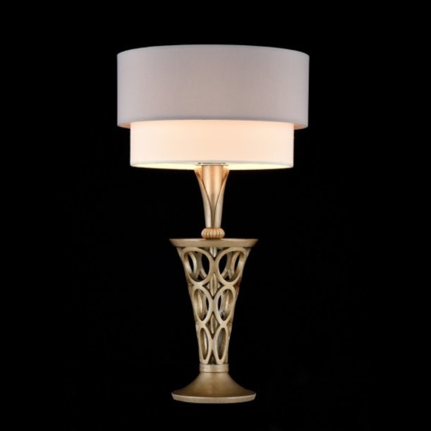 Арматура из металла покрашенного в цвет "жемчужного золота". Основание светильника украшено декоративным элементом ручной работы из современного экологичного высокопрочного материала, полирезина. Двойной абажур из материала ПВХ, покрытого хлопковой тканью двух цветов.