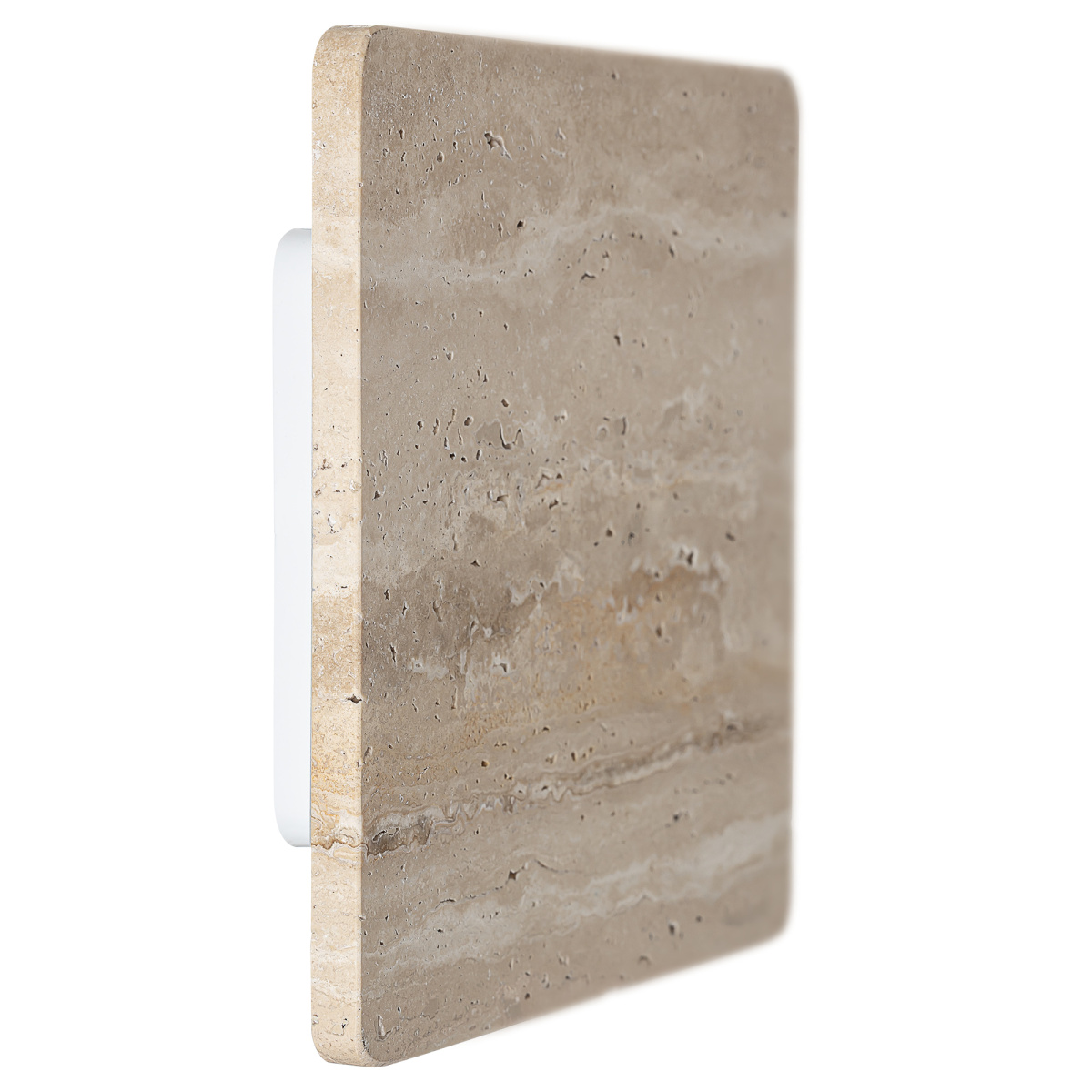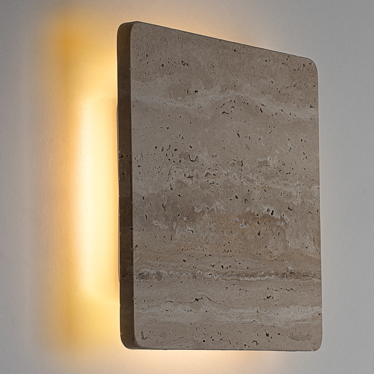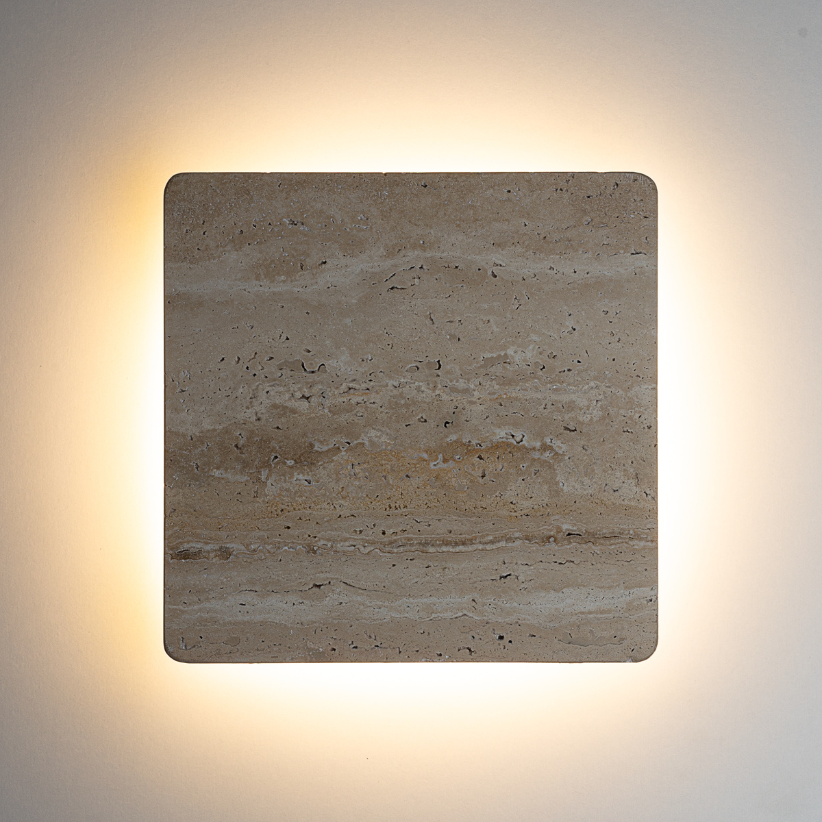 Арматура металлическая, корпус — квадратной формы со скругленными углами, из натурального камня травертина бежевого оттенка. Светодиоды с цветовой температурой 3000К создают изящный рисунок света, наполняя пространство тёплым, уютным сиянием. Мощность светильника составляет 12Вт.