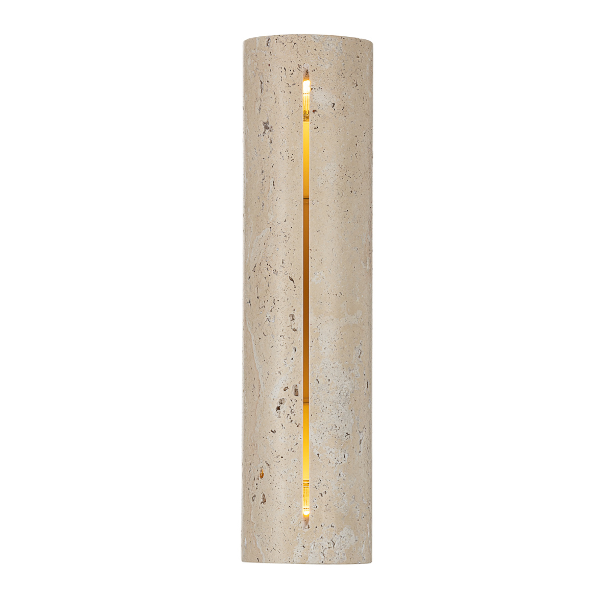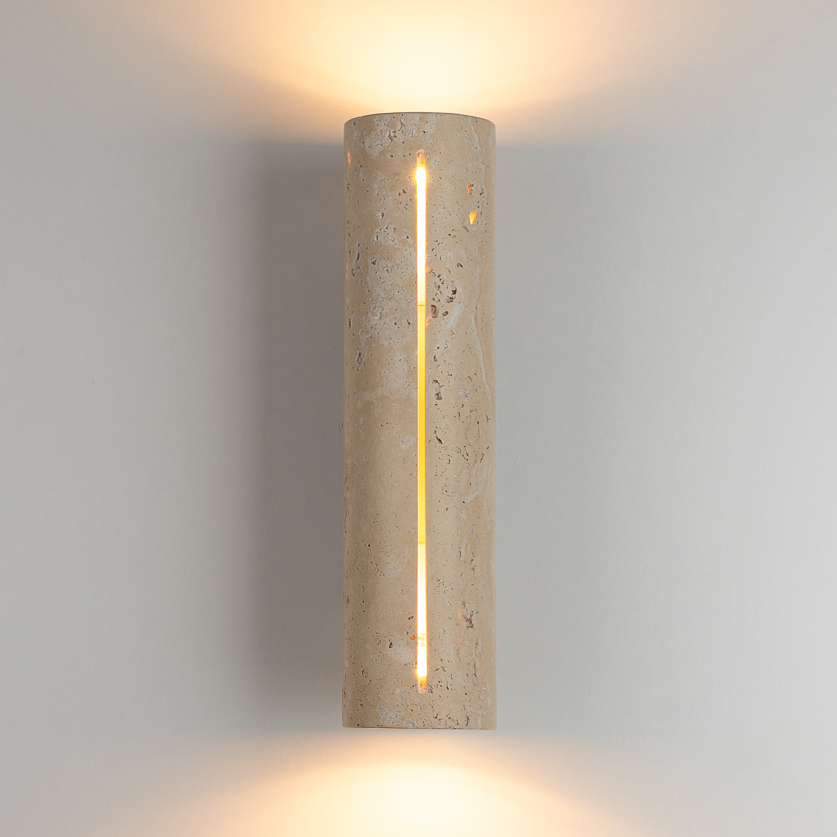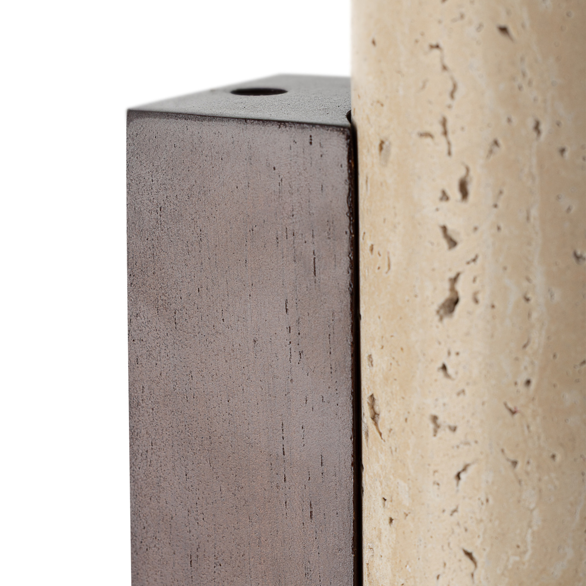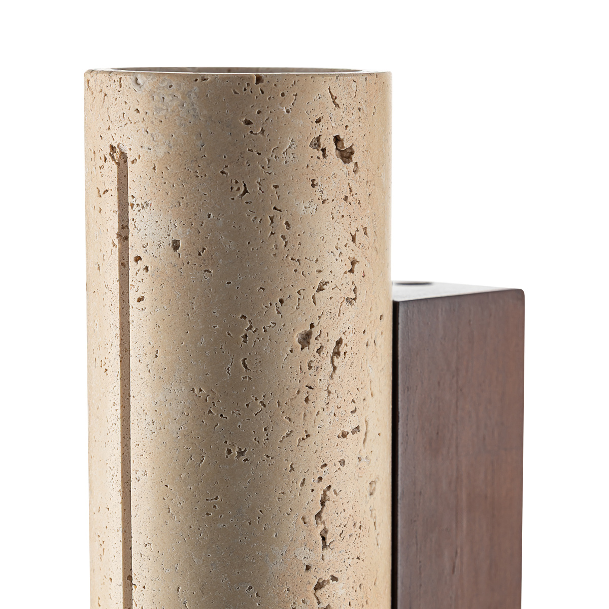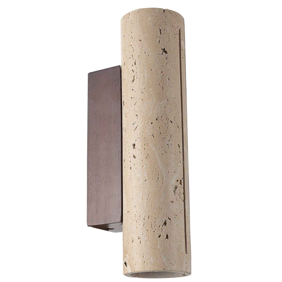 Основание деревянное, кофейного оттенка. Плафон в форме цилиндра, из натурального камня травертина бежевого оттенка. Светодиоды с цветовой температурой 3000К создают направленный свет, наполняя пространство тёплым, уютным сиянием. Мощность светильника составляет 15Вт.