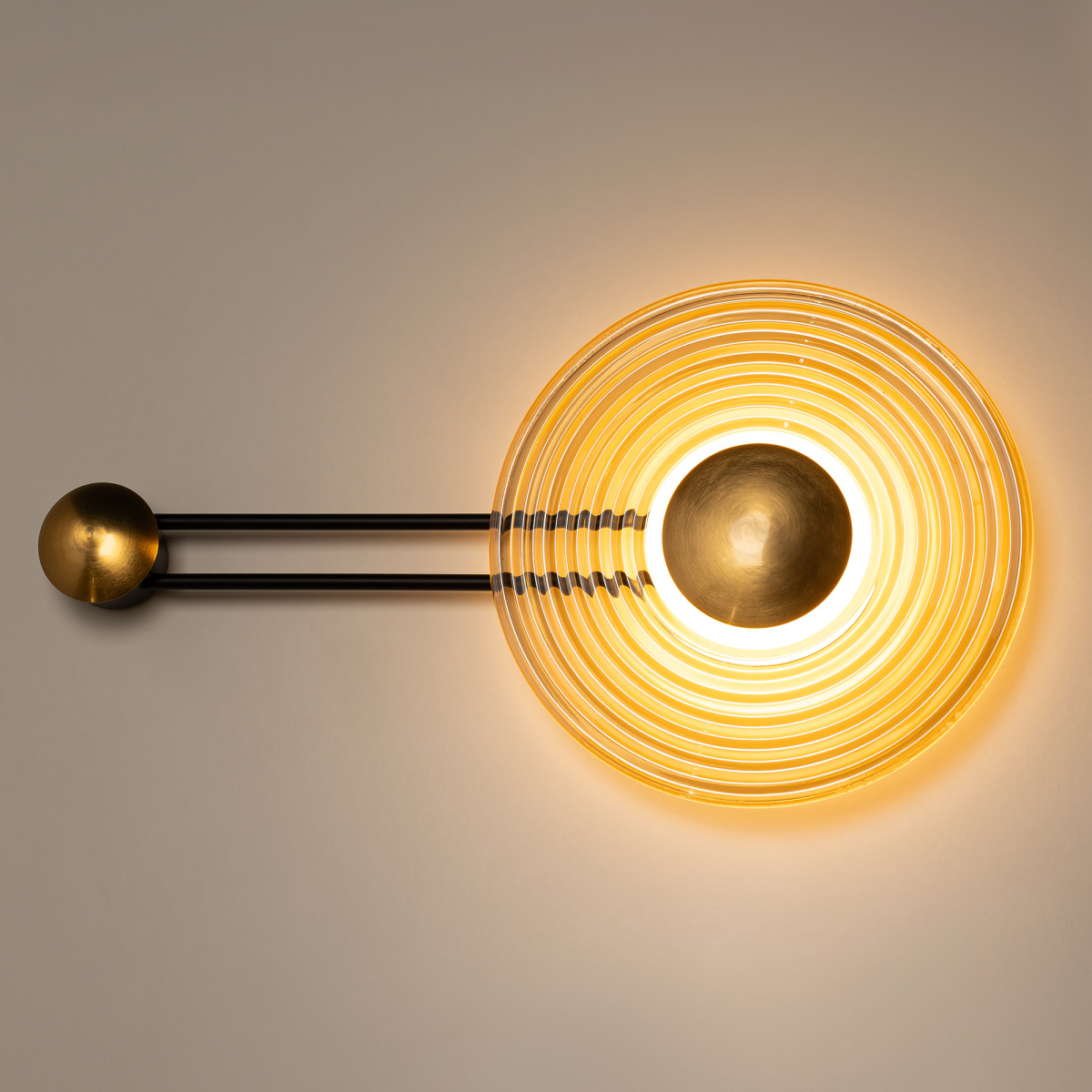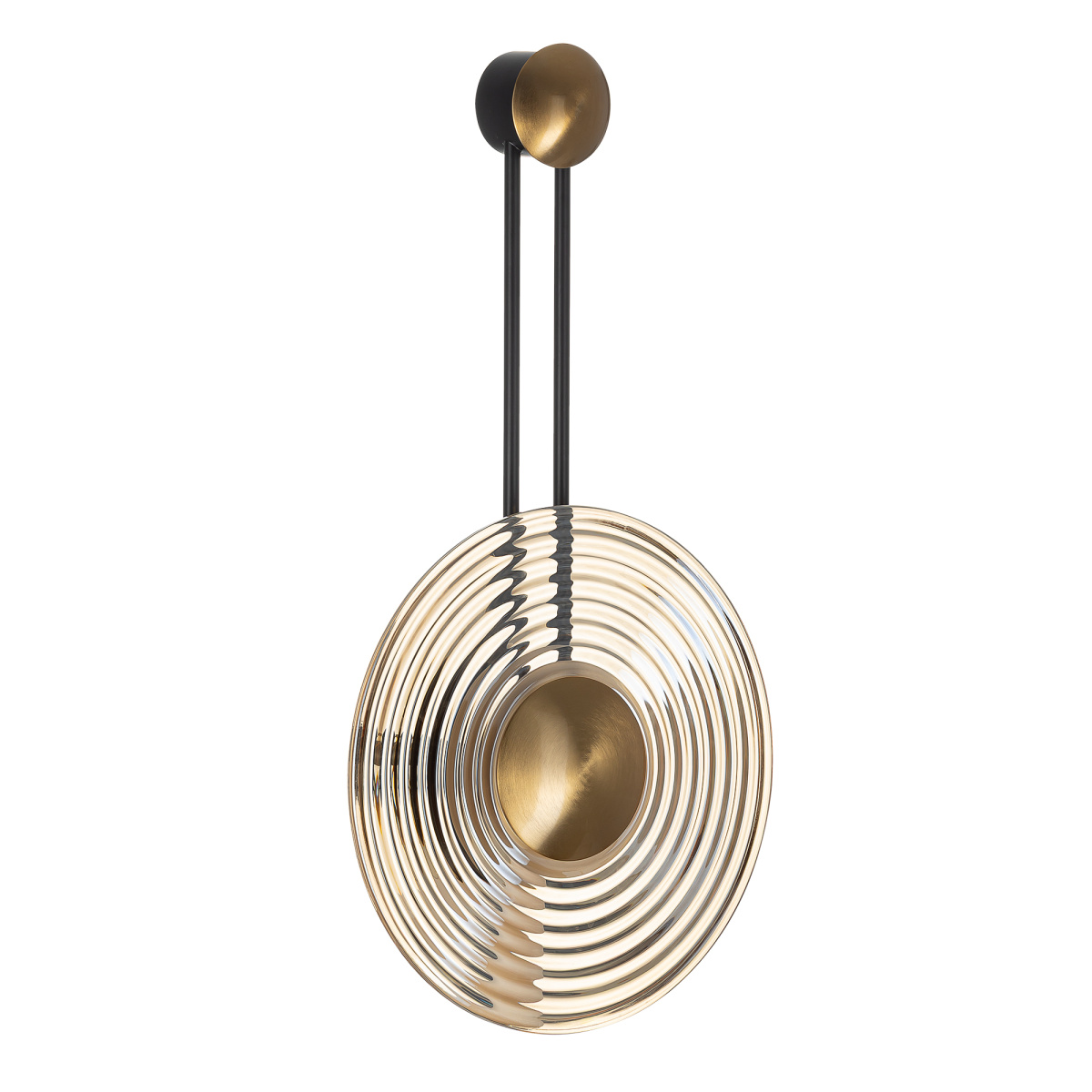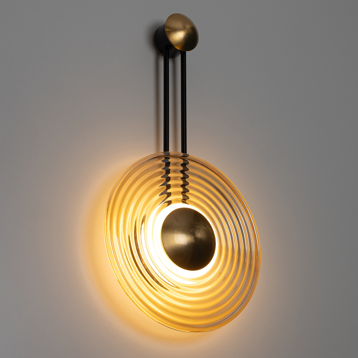 Корпус светильника изготовлен из металлического сплава, черные элементы сочетаются с латунными. Большой круглый ребристый плафон — из стекла оттенка шампань. Благодаря встроенным светодиодам с цветовой температурой 3000К бра светит мягким, равномерным светом без мерцания и пульсаций. Общая мощность светильника — 8Вт.
